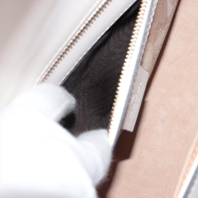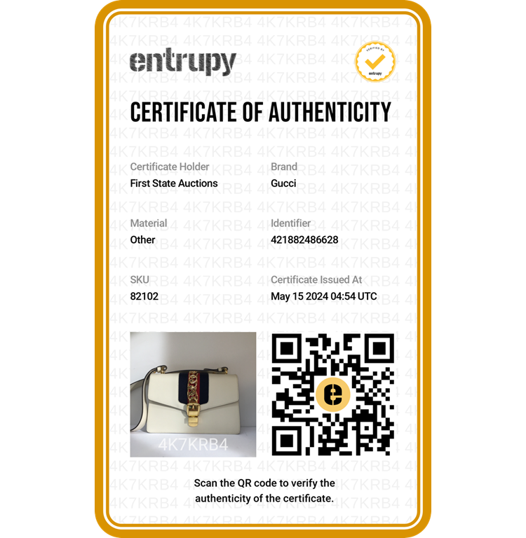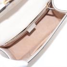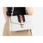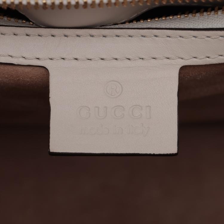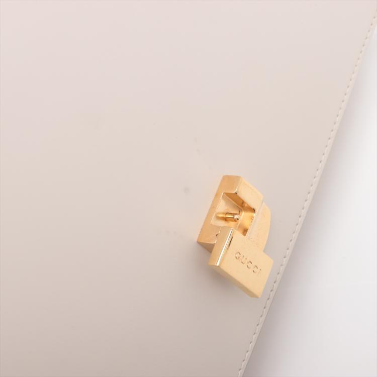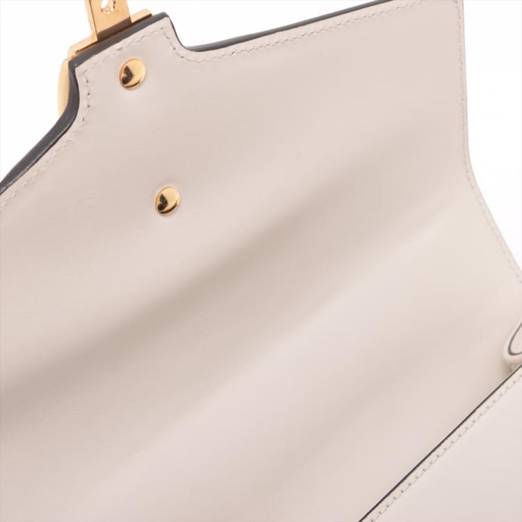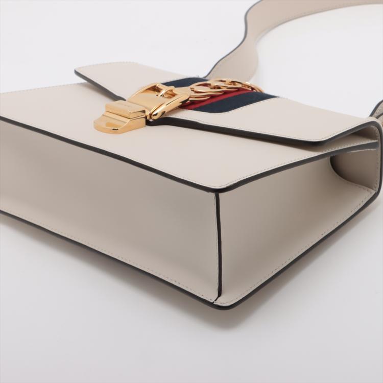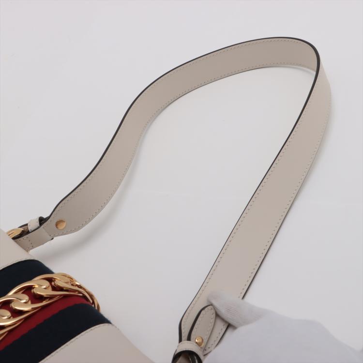 Gucci small Sylvie shoulder bag in off white calfskin leather. Featuring a front flap detailed with a central red and navy web stripe, a chain buckle lock closure at the front, gold-tone hardware. The flap opens to a microfiber lining interior with zipper and patch pockets. Approximate dimensions: 26cm(W) x 17cm(H) x 8cm(D), 35cm leather strap drop. Note: striped ribbon NOT included. With Entrupy Certificate of Authenticity. (Pre-owned)