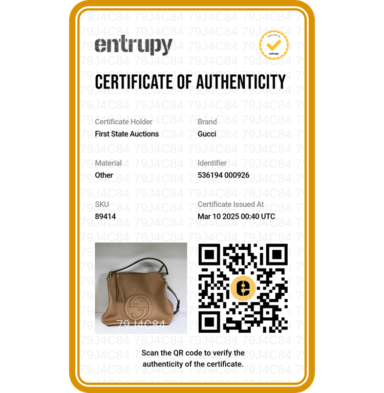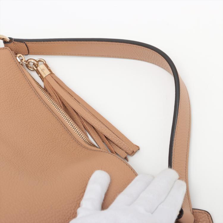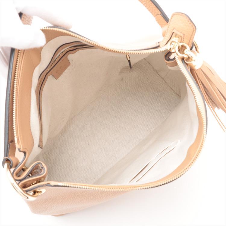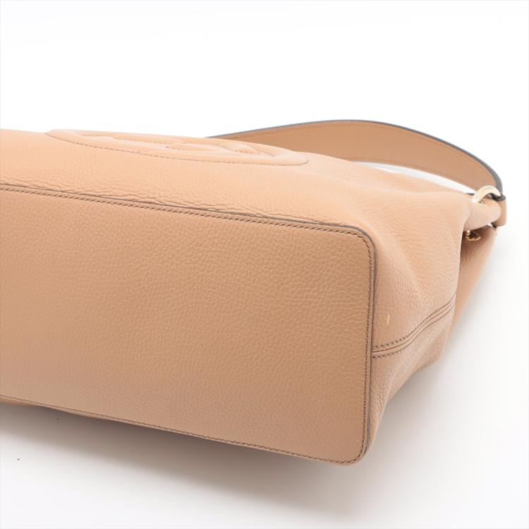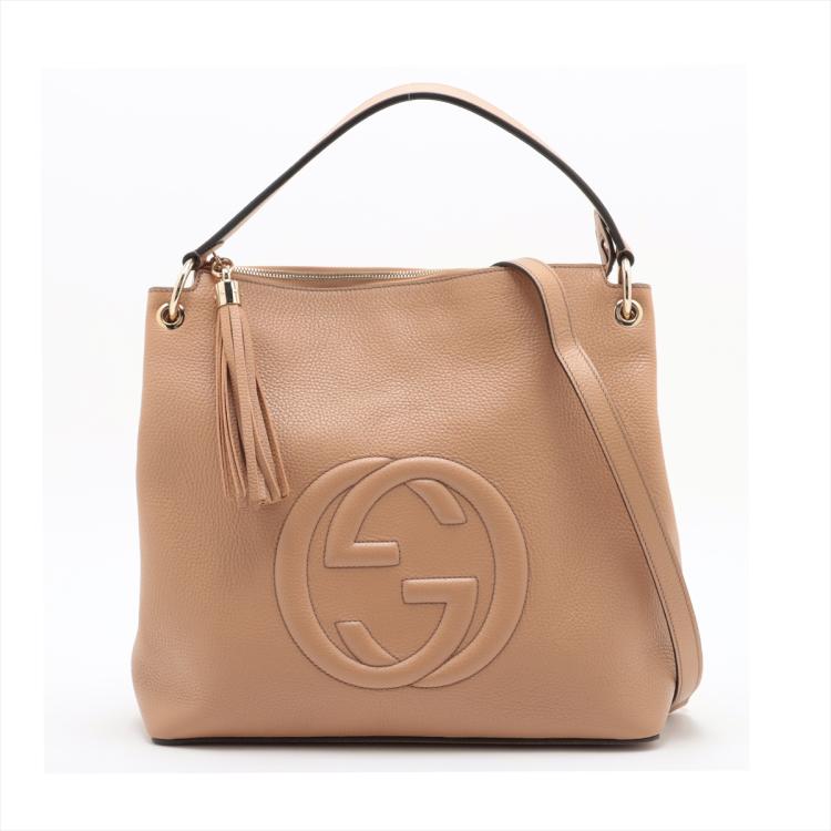 Gucci Soho 2way shoulder bag in beige grainy calfskin leather. Featuring light gold-tone hardware, single flat top handle, interlocking GG logo stitched at front, and a detachable shoulder strap. The top zipper closure with tassel detailed puller opens to beige fabric lining interior with zipper and patched pockets. Approx dimensions: Approximate dimensions: 34cm(B-W) x 31cm(H) x 14cm(D), 13cm handle drop, 45cm strap drop. With Entrupy Certificate of Authenticity. (Pre-owned)