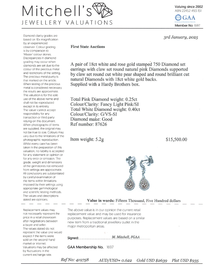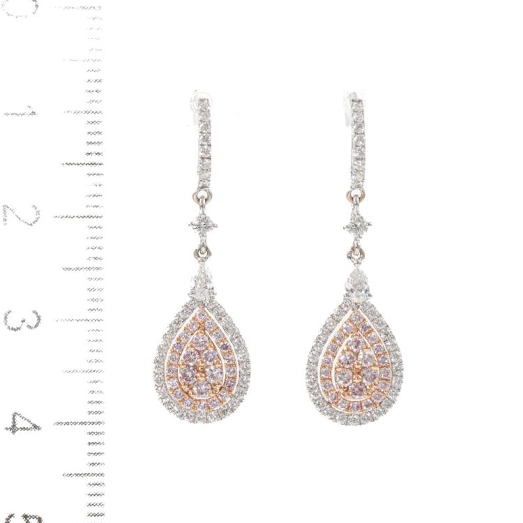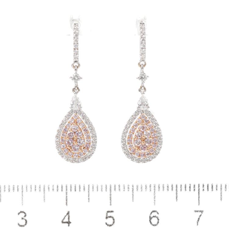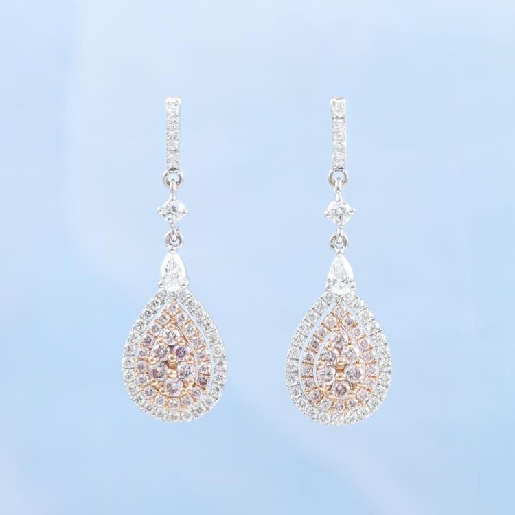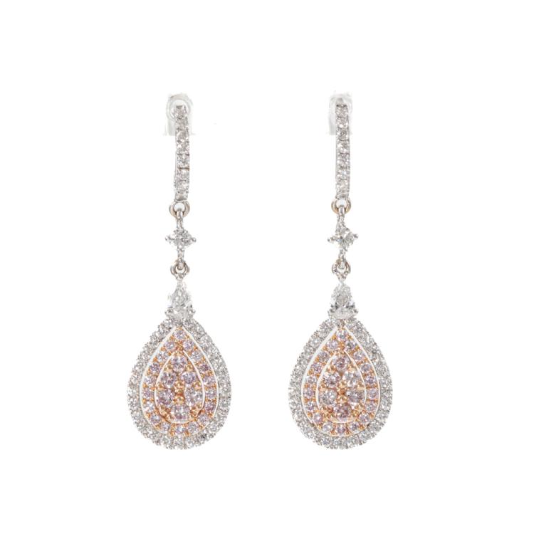 Hardy Brothers Diamond drop earrings with round & pear shape Natural Pink & White Diamonds totalling approximately 0.65ct (Estimated grading: Light Pink G VS-SI). 18ct rose and white gold with 18ct white gold backs. Weight: 5.2g. With Hardy Brothers Box. With Certificate #419758. (Pre-owned)
