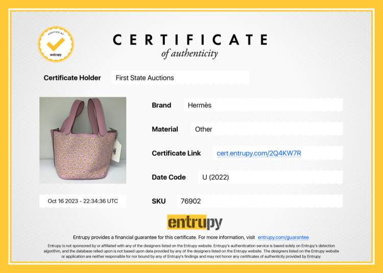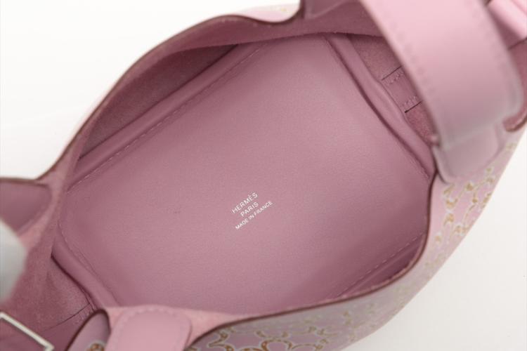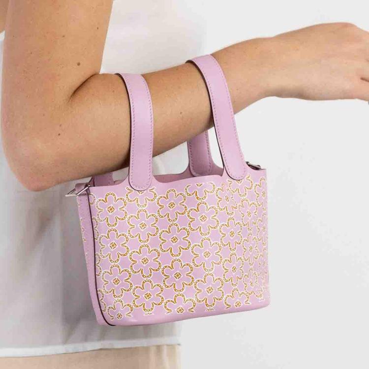 Hermès Micro Picotin bag in Mauve Sylvestre Swift leather with lucky daisy print (stamp U, 2022). Silver-toned hardware, open top, pink suede lining interior. Approximate dimensions: 12.5cm(L) x 12cm(H) x 9.5cm(D), 9cm handle drop. Accompanied by Hermes padlock, keys and dust bag. With Entrupy Certificate of Authenticity. (Pre-owned)