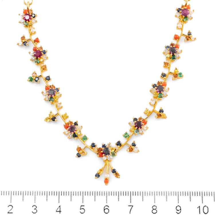 Joyalukkas Navarathna necklace and round natural mixed gemstones (including 9 Rubies totalling approximately 1.80ct and blue Sapphire, Citrine, Emerald, Carnelian, Moonstone & seed Pearl of approximately size 1.9mm - 2.2mm) and 9 round natural Diamonds totalling 0.32ct (Estimated grading: G VS). Adjustable max length: 39cm. 22ct yellow gold with 916 stamp. UAE made. Weight: 28.4g. With Joyalukkas box. With Certificate #418681. (Pre-owned)