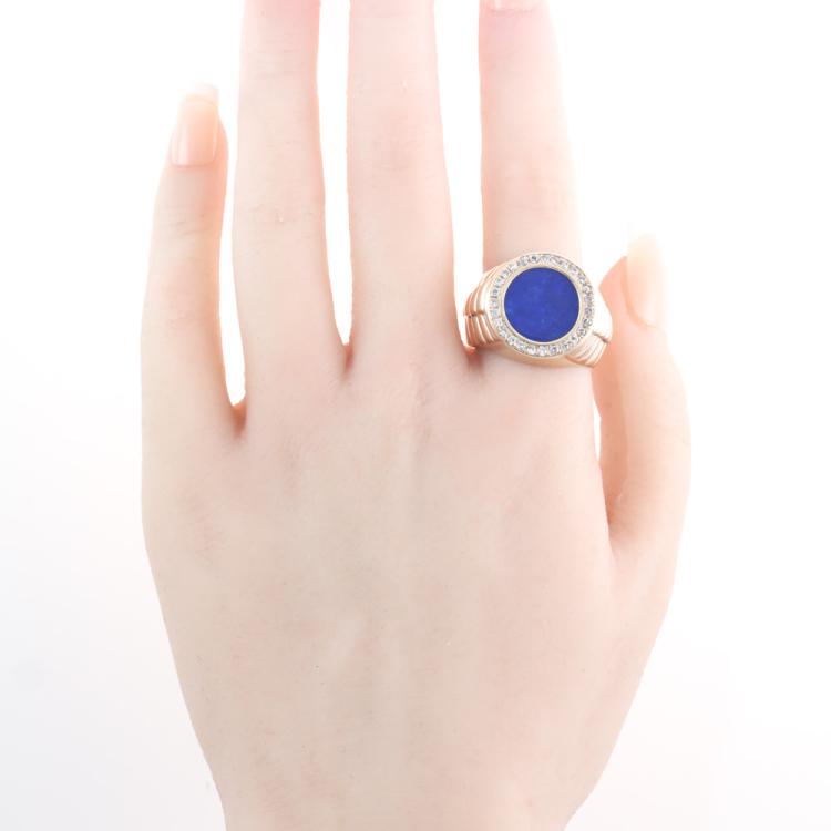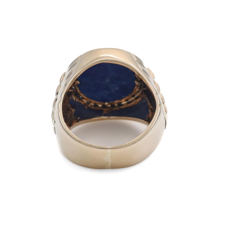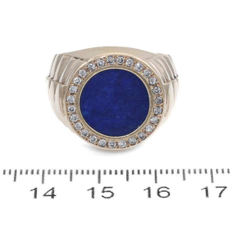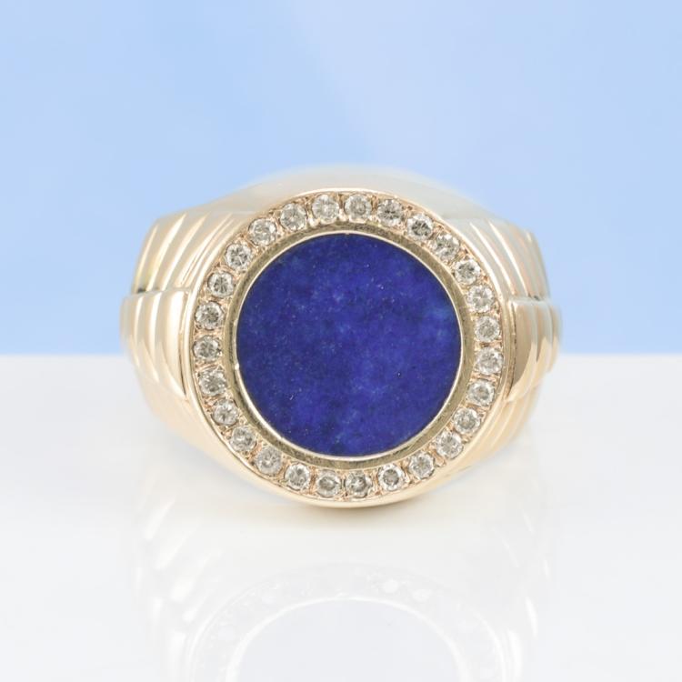Mens signet ring with round Lapis Lazuli measuring 1.3cm in diameter and round Natural Diamonds totalling approximately 0.40ct (Estimated grading: H-I SI). 14ct yellow gold. Ring size R. Band width: 6.9mm - 9.6mm. Weight: 15.5g. (Pre-owned)