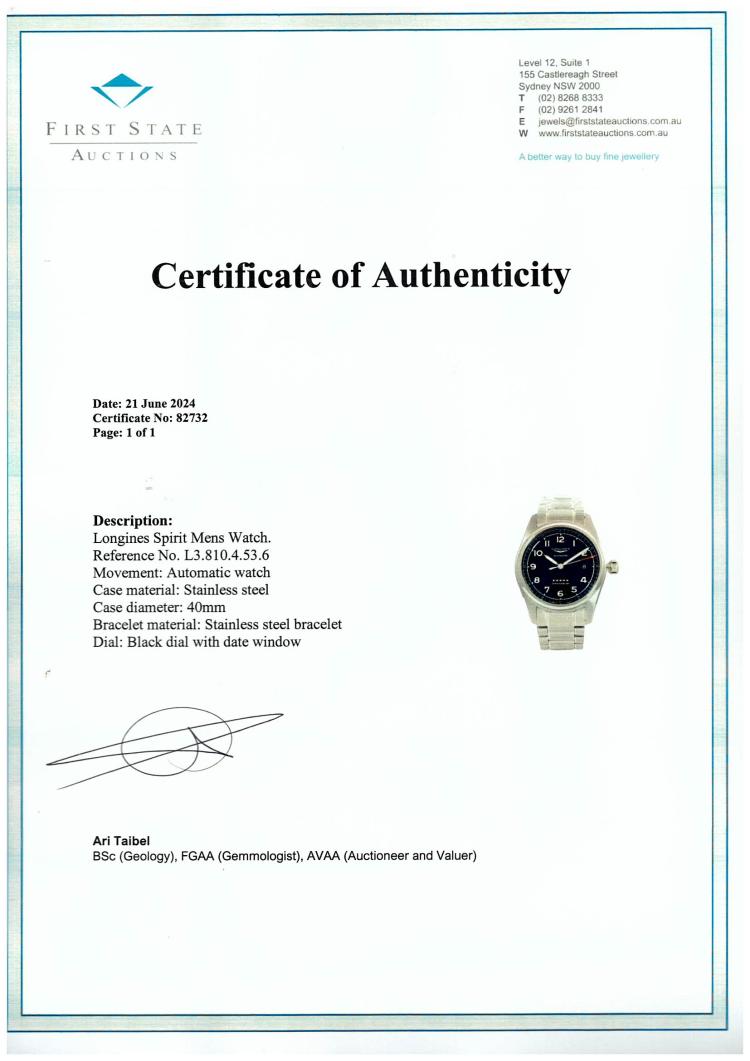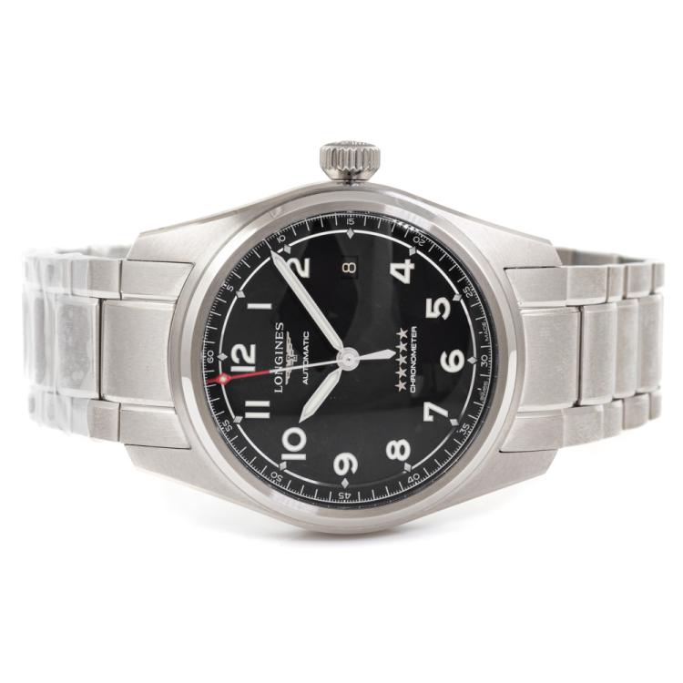 Longines Spirit stainless steel automatic mens watch. Black dial, date, case diameter: 40mm, wrist size: 19.5cm, Swiss made. Ref# L3.810.4.53.6. With Longines stainless steel bracelet and clasp. With FSA Certificate of Authenticity, Longines COSC Certificate card and Longines box. 3 month FSA warranty (As new, Note: minor scratch on bezel and back case due to being display stock)