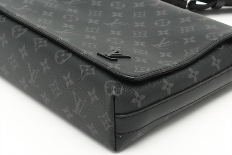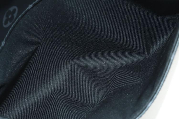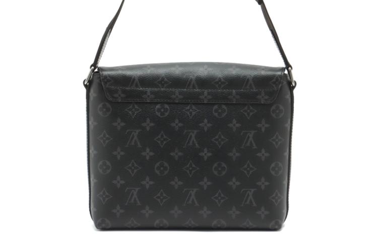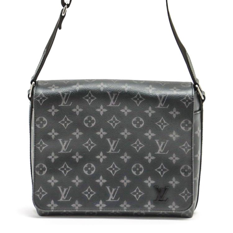 Louis Vuitton District PM bag in Monogram Eclipse coated canvas. Featuring black cowhide-leather piping trim, a zipped pocket at back, silver-toned hardware, flap with magnetic closure. The flap opens to an inside front pocket and a black fabric interior with patch pockets. Approximate dimensions: 26cm(L) x 20cm(H) x 7cm(D) and an adjustable strap drop: 31-62cm. Accompanied by LV dust bag and box. With Entrupy Certificate of Authenticity. (Pre-owned)