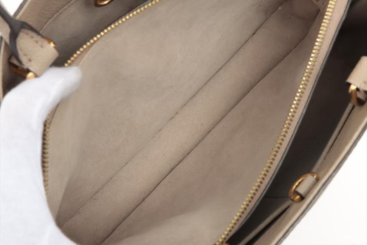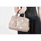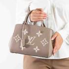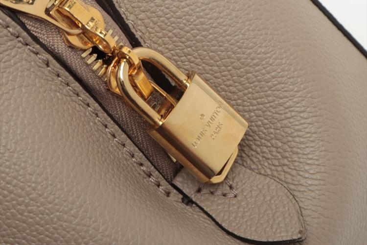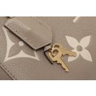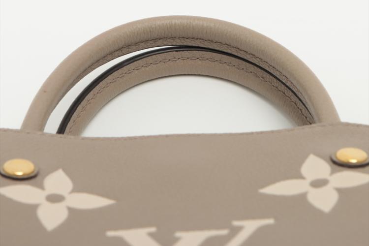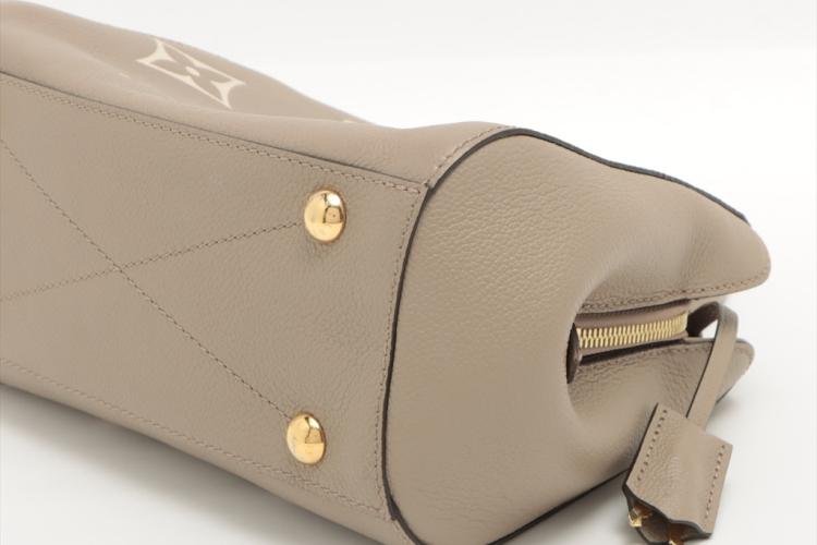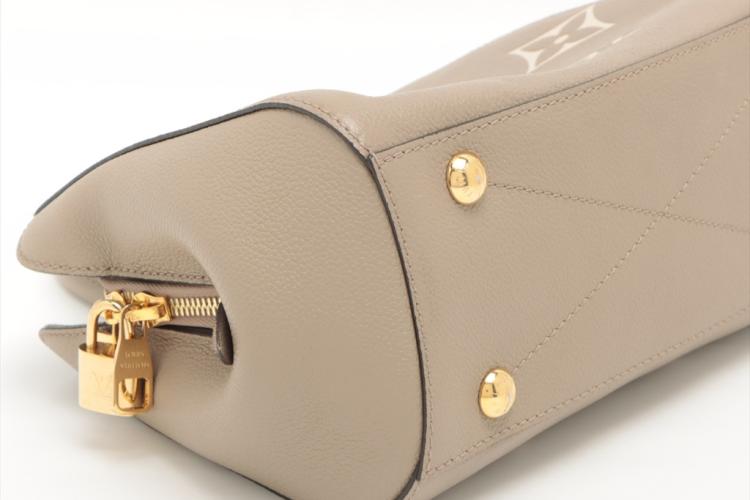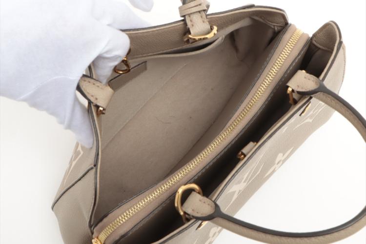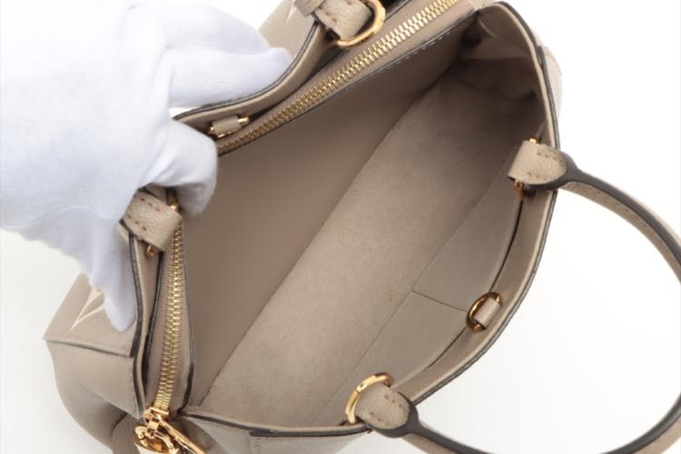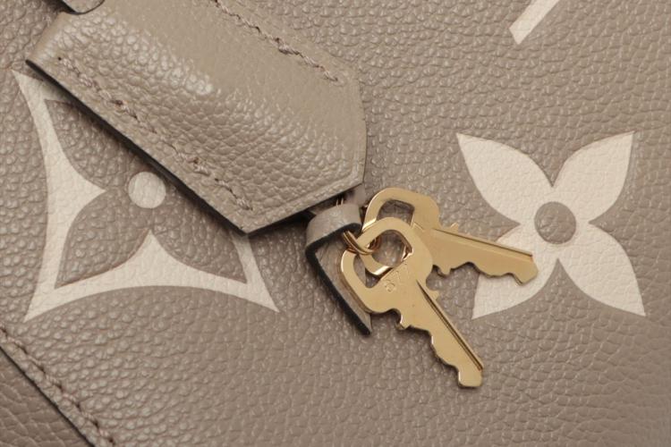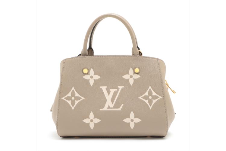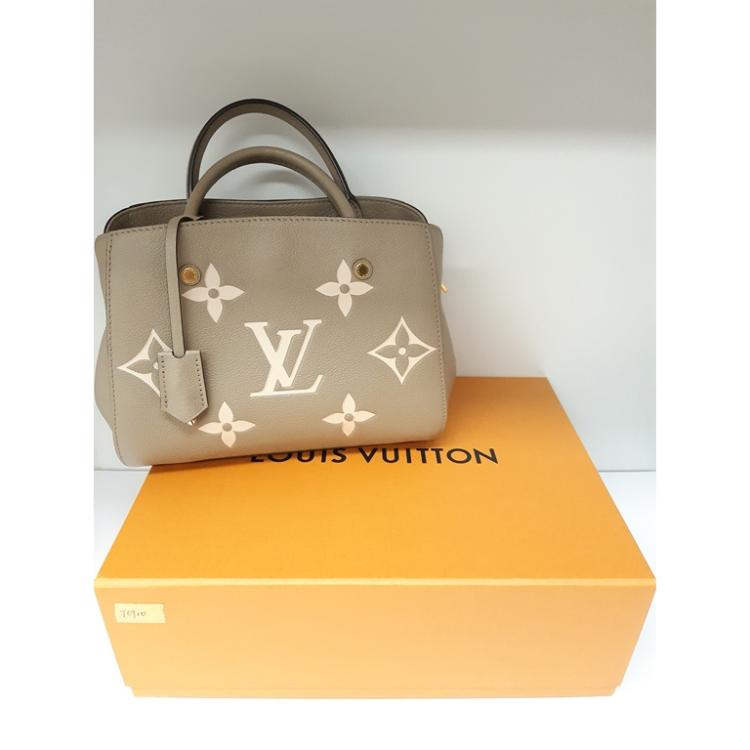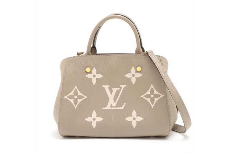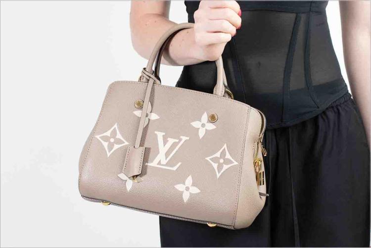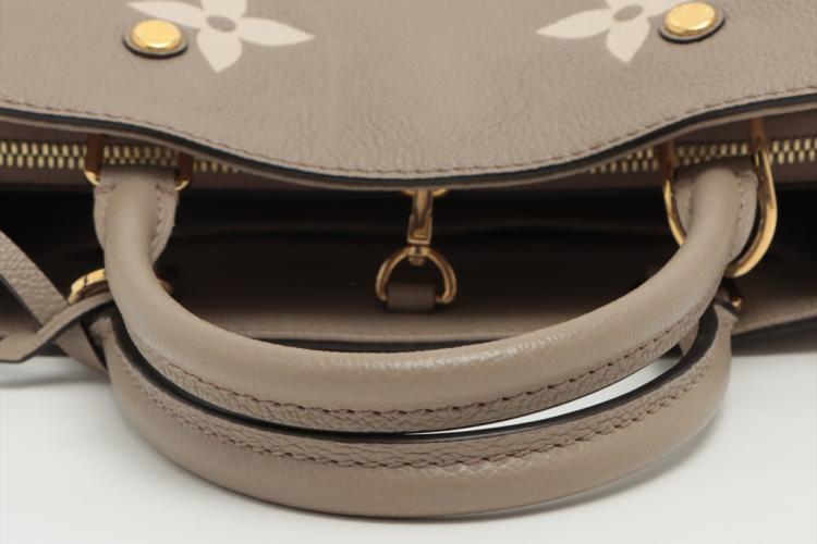 Louis Vuitton Empreinte Montaigne BB in Tourtelle and Crème calfskin leather. Featuring embossed Monogram Giant pattern, gold hardware, leather top handles and detachable shoulder strap. The bag opens to a microfibre/leather interior with a zip compartment and patch pockets. Accompanied by gold lock, keys, a leather clochette and a LV box. Approximate dimensions: 25cm(L) x 19.5cm(H) x 13.5cm(D). With Entrupy Certificate of Authenticity. (Pre-owned)