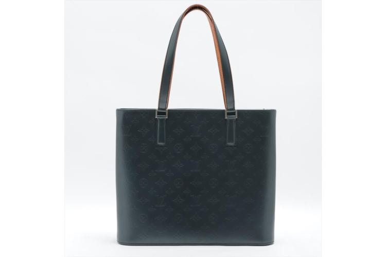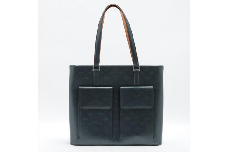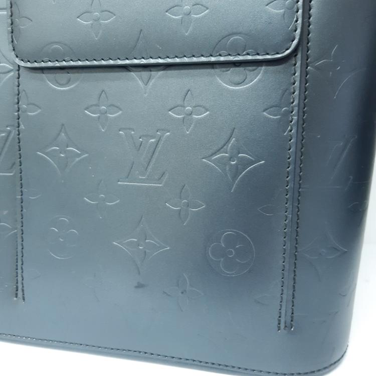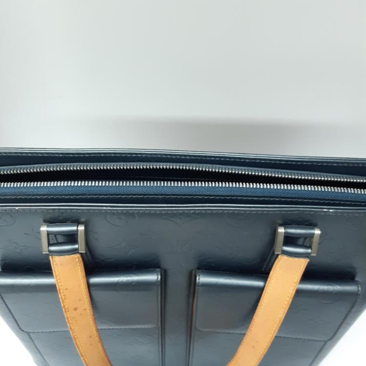 Louis Vuitton Wilwood tote in blue Monogram mat leather. Featuring silver-tone hardware, dual leather handles, 2 exterior pockets with flaps and magnetic button closures. The top with zipper closure opens to a blue canvas lining interior with zippered and patched pockets. Approximate dimensions: 36cm (L) x 10cm (H) x 31cm (D), and 23cm shoulder drop. With Entrupy Certificate of Authenticity. (Pre-owned)