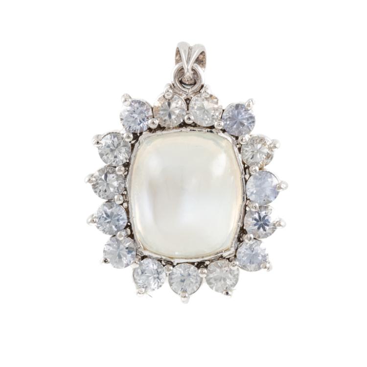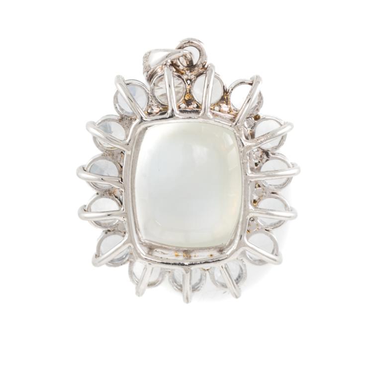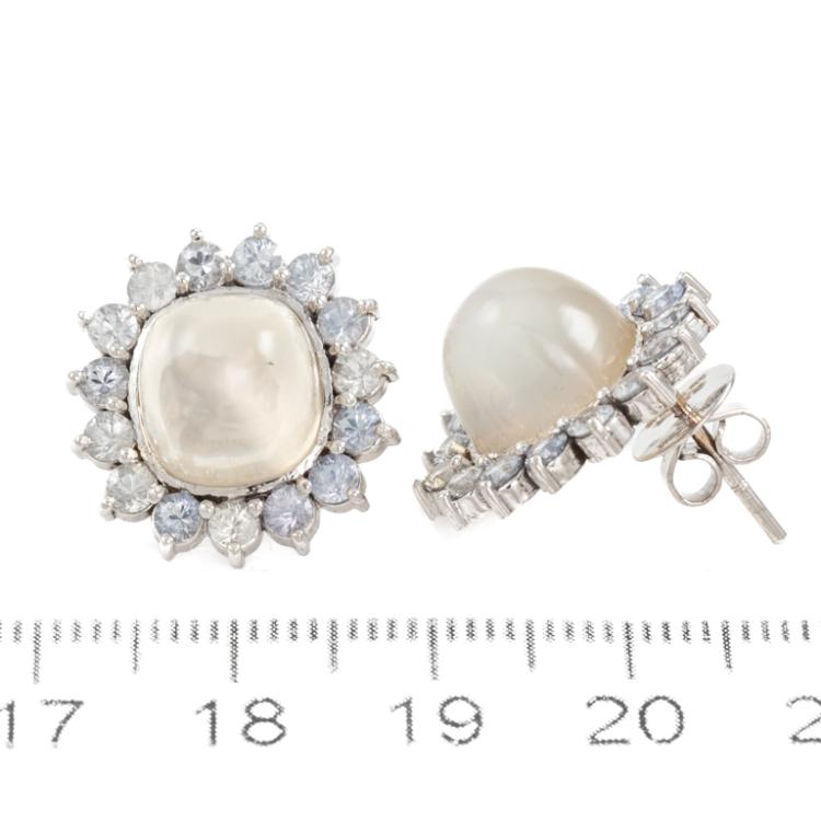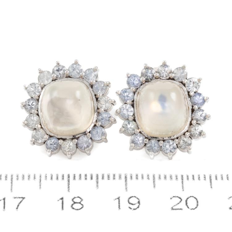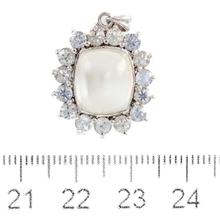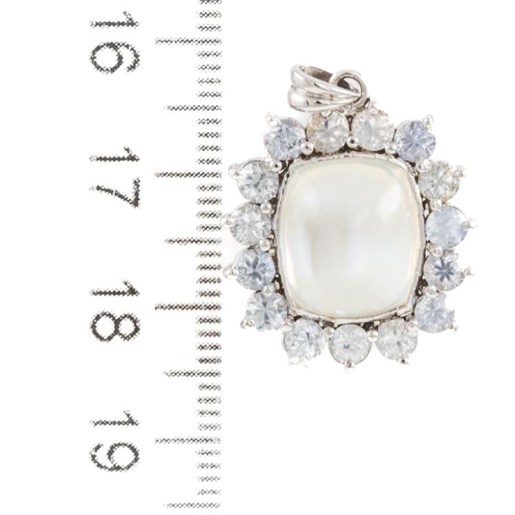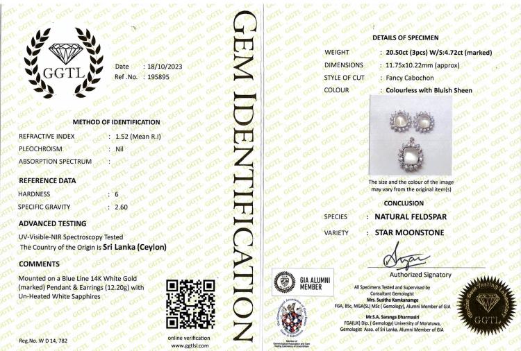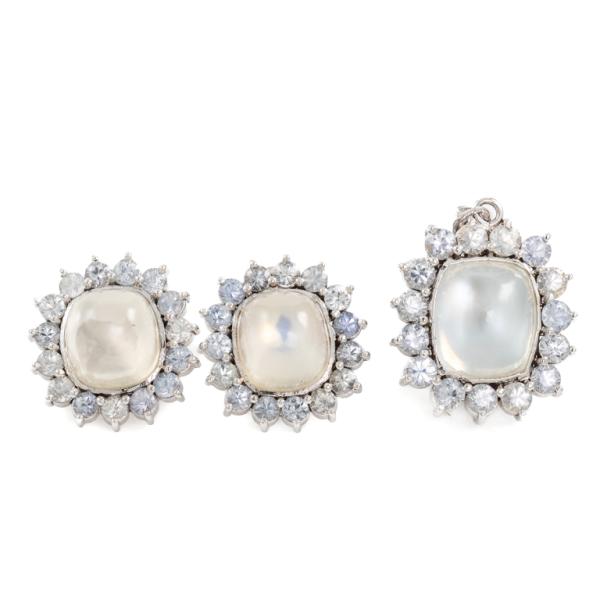 Moonstone & Sapphire pendant & earrings set. Moonstone and Sapphire pendant with cabochon cut Natural Moonstone of 6.50ct and round white unheated Natural Sapphires totalling 2.65cts, no chain provided. Matching earrings with 2 cabochon cut Moonstones totalling 14.00cts and round white unheated Natural Sapphires totalling 2.07cts. Both set in 14ct white gold. With GGTL report #195895. Total weight: 12.2g. (As New)