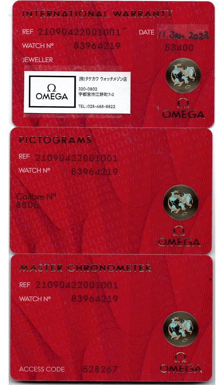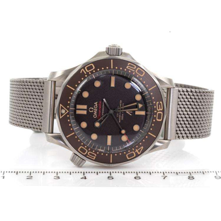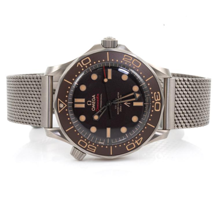 Omega Seamaster Diver 007 Edition titanium automatic mens watch. Brown dial, case diameter: 42m, adjustable max wrist size: 20.5cm, Swiss made. Ref# 210.90.42.20.01.00. With Omega titanium bracelet and clasp. With Certificate of Authenticity, Omega International Warranty card dated 11/01/2023, Omega Pictograms card, Omega Master Chronometer card and Omega case. Balance of 5 year Omega manufacturer warranty applies. (Pre-owned)