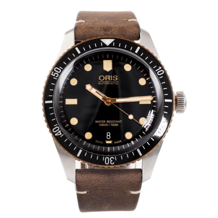 Oris Divers Sixty-Five stainless steel automatic mens watch. Black dial, date, case diameter: 40mm, strap length: 21cm, Swiss made. Ref# 733 7707 4354LS. With Oris brown leather strap and buckle. With FSA Certificate of Authenticity and Oris box. 3 month FSA warranty (As new, Note: scratches on case and wear marks on strap due to being display stock)