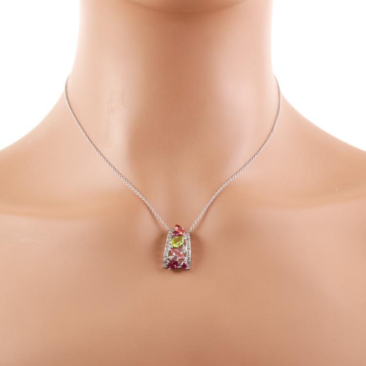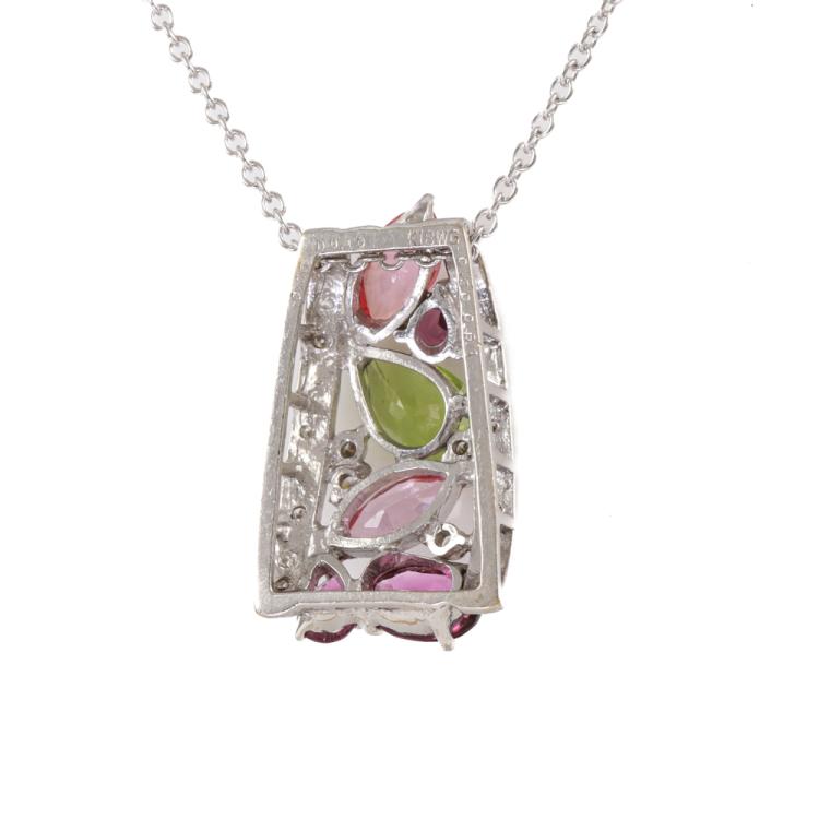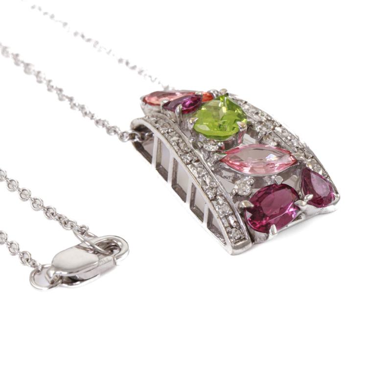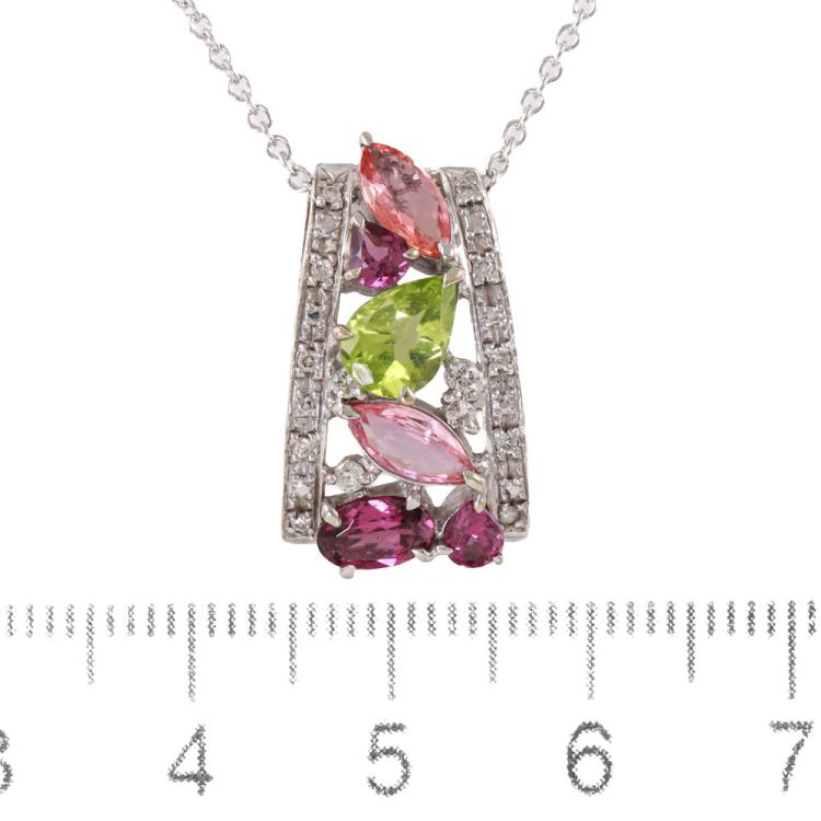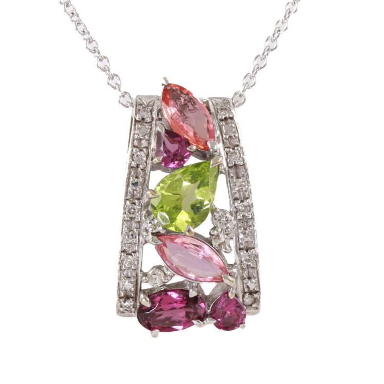 Sapphire, Peridot, Garnet and Diamond pendant with marquise cut Natural Padparadscha Sapphires totalling approximately 0.87ct, Pear shape Natural Peridot of 0.61ct, oval & pear shape Natural Garnet totalling 0.80ct and round Natural Diamonds totalling 0.10ct. 18ct white gold and 18ct white gold 40.5cm chain. Weight: 5.4g. (Pre-owned)