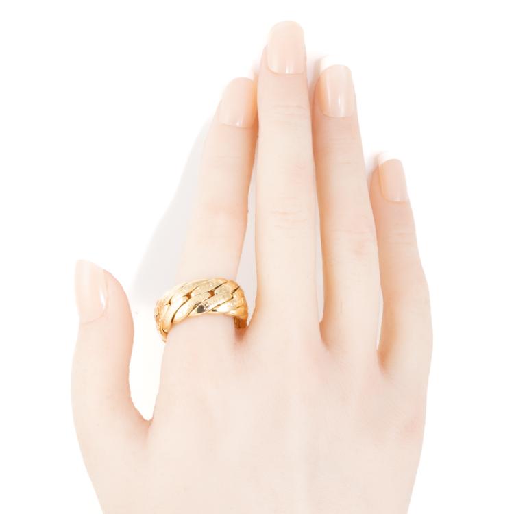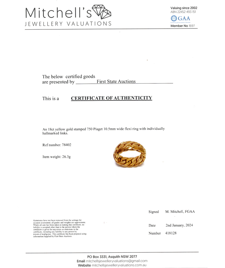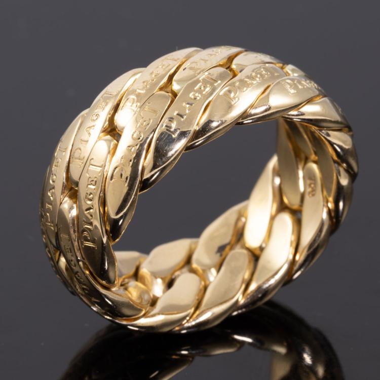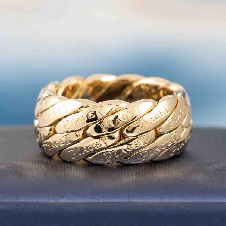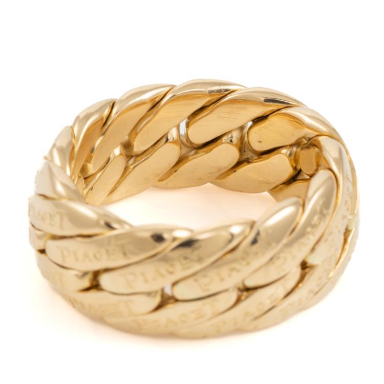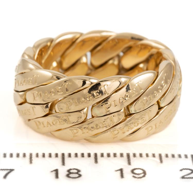 Piaget gold ring. 18ct yellow gold. Ring size W - ring resizing is not recommended. Band width: 10.5mm. Weight: 26.3g. With Certificate #418128. (Pre-owned)