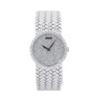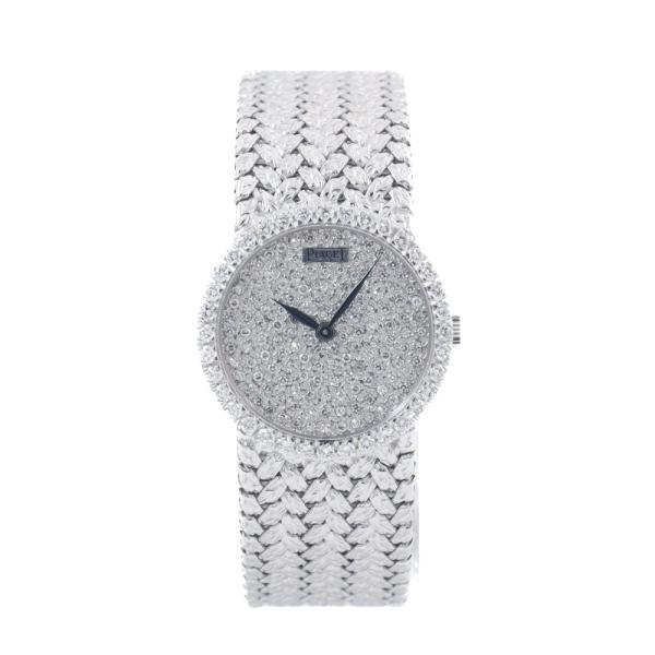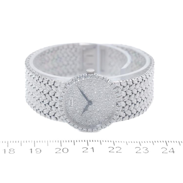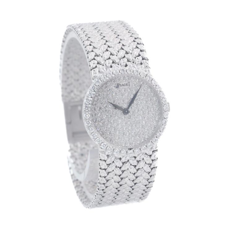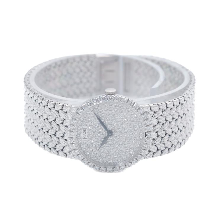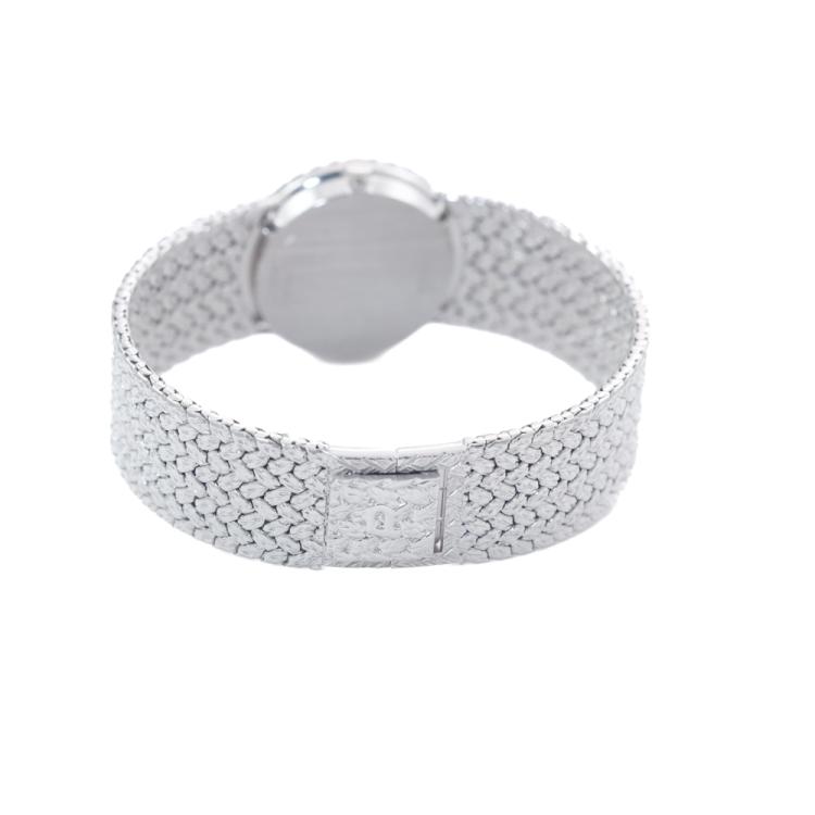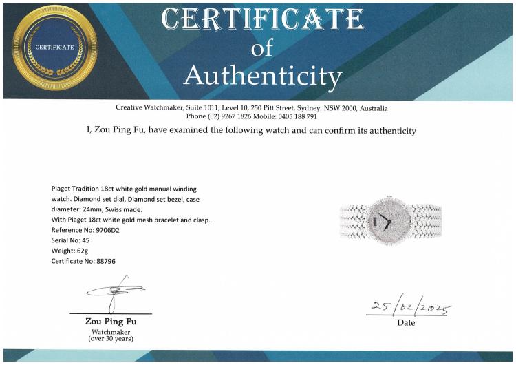 Piaget Tradition 18ct white gold manual winding ladies watch. Diamond set dial, Diamond set bezel, case diameter: 24mm, bracelet length: 15cm, Swiss made. Ref# 9706D2. With Piaget 18ct white gold mesh bracelet and clasp. With Certificate of Authenticity. 3 month FSA warranty. (Pre-owned)