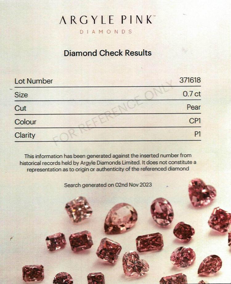 A loose pear shape Pink Argyle Natural Diamond of 0.70ct (with copy of Argyle Diamond report graded as CP1 P1 #371618). (As New)