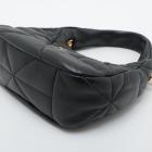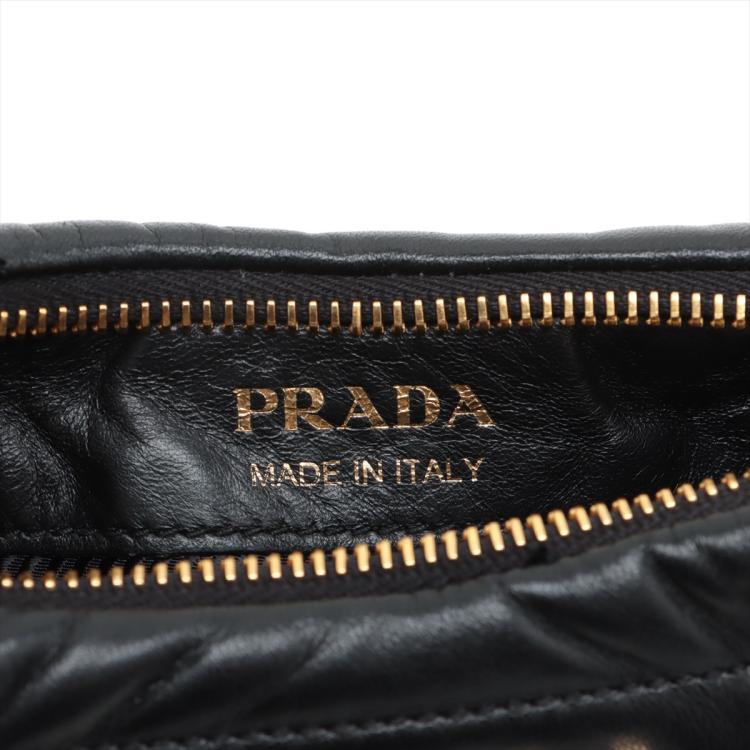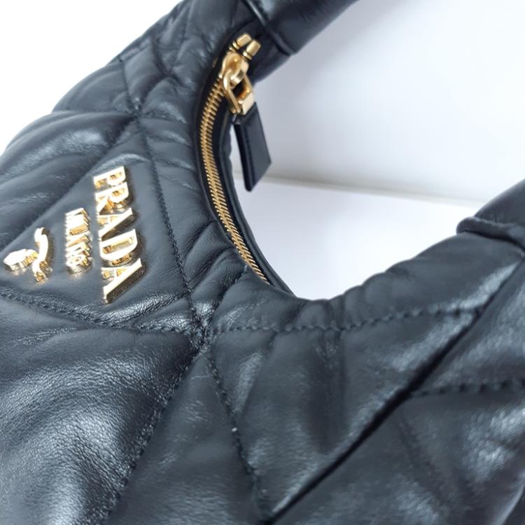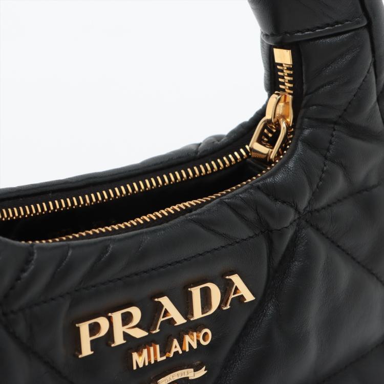 Prada Logo-Plaque shoulder bag in black triangle-quilted Nappa leather. Featuring single leather handle, hardware logo plaque at front , gold-tone hardware. The zipper closure opens to black nylon lining interior with both a zipper and a leather patch pocket. Approximate dimensions: 21.5cm(L) x 16.5cm(H) x 7cm(D), 14.5cm handle drop and 56cm detachable strap drop. Accompanied by Prada receipt (Dated: 03/23) and dust bags. With Entrupy Certificate of Authenticity. (Pre-owned)
