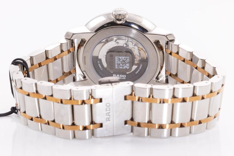 Rado Diamaster stainless steel automatic mens watch. Black dial, date, case diameter: 41mm, wrist size: 20cm, Swiss made. Ref# R14077163. With Rado two tone bracelet and clasp. With Rado 2 Year International Warranty Card and Rado box. Rado warranty applies. (As New, Note: minor scratches on case and light wear on strap due to being display stock)