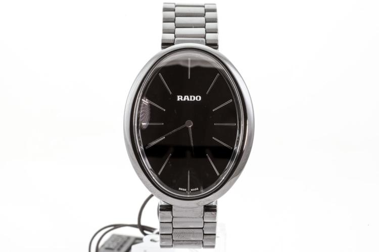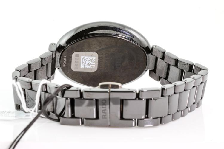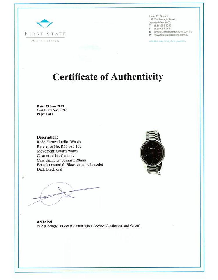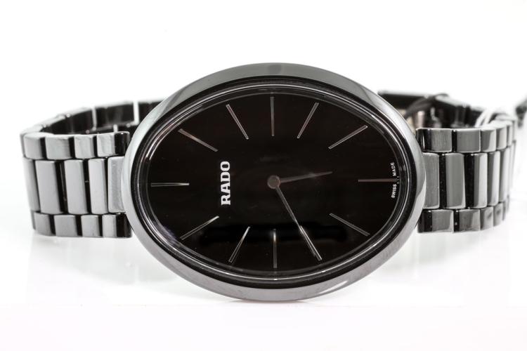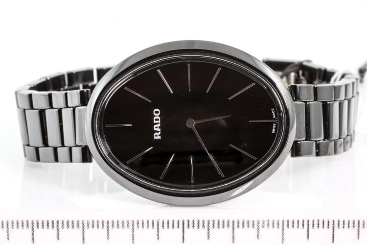 Rado Esenza ceramic quartz ladies watch. Black dial, case diameter: 33mm x 28mm, wrist size: 18cm, Swiss made. Ref# R53 093 152. With Rado black ceramic bracelet and clasp. With FSA Certificate of Authenticity, Rado standard instruction manual booklet and Rado box. 3 month FSA warranty. (As new, Note; minor scratches on case and bracelet due to being display stock)
