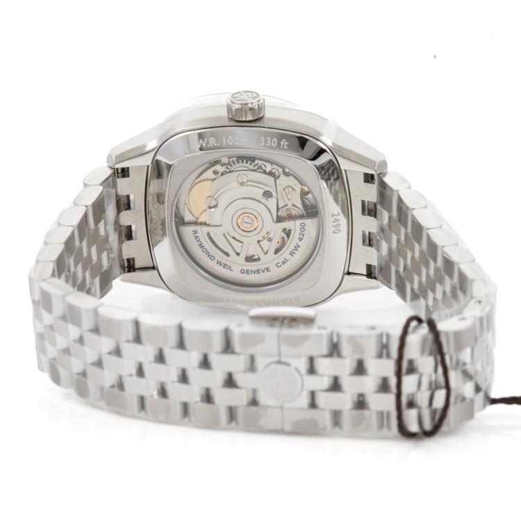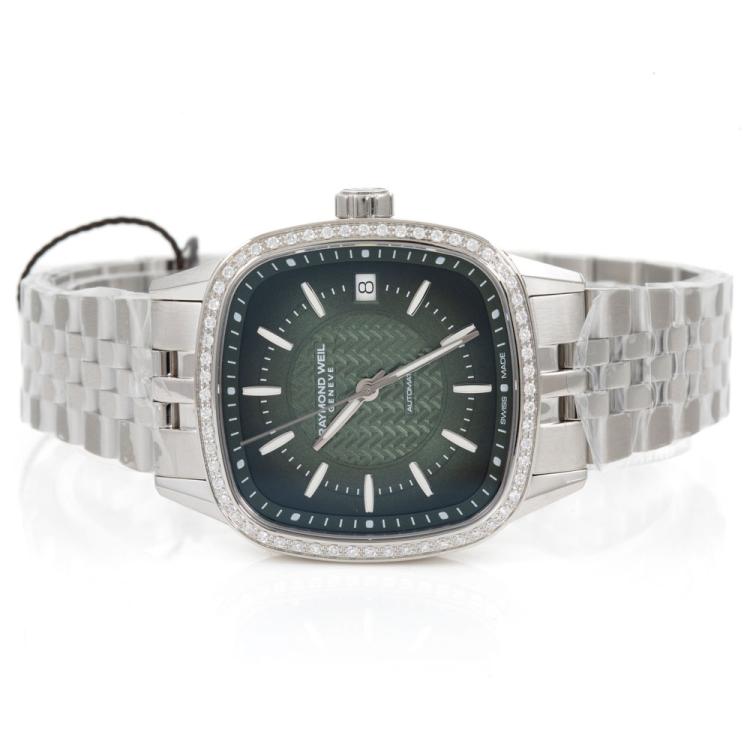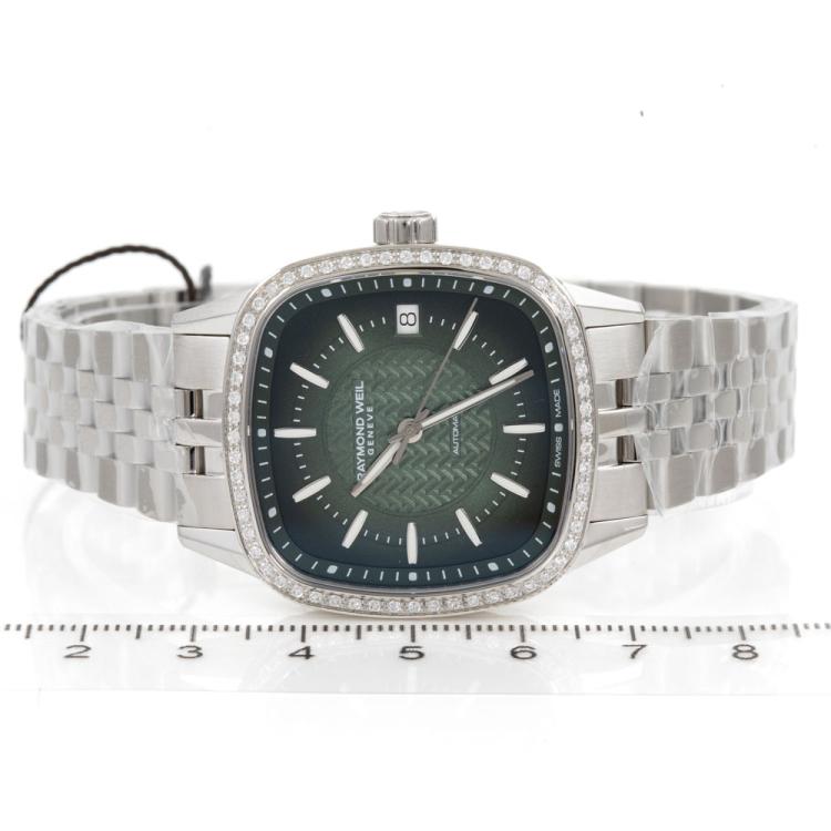Raymond Weil Freelancer stainless steel automatic ladies watch. Green dial, diamond (lab grown) set bezel, case diameter: 34.5cm, wrist size: 18.5cm, Swiss made. Ref# 2490-STS-52051. With Raymond Weil stainless steel bracelet and clasp. With Raymond Weil Guarantee card, Raymond Weil Certificate of Authenticity and Raymond Weil box. 12 month FSA warranty (As new, Note: case and bracelet on original wrapping)