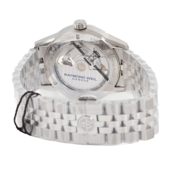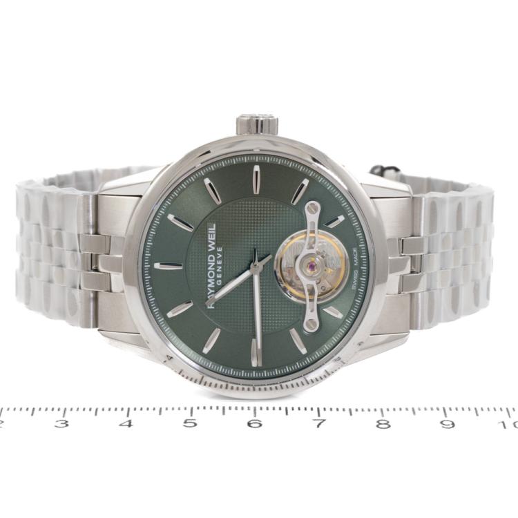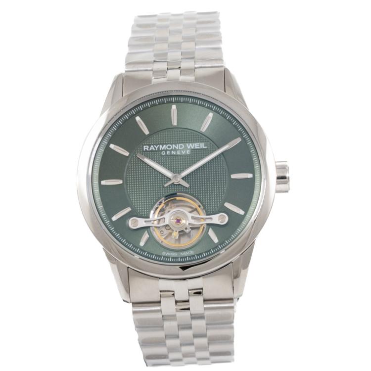 Raymond Weil Freelancer stainless steel automatic mens watch. Green dial, case diameter: 42mm, wrist size: 21cm, Swiss made. Ref# 2780-ST-52001. With Raymond Weil stainless steel bracelet and clasp. With Undated Raymond Weil Guarantee card and Raymond Weil box. 12 month FSA warranty (As new, Note: case and bracelet on original wrap)