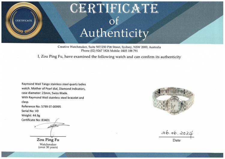 Raymond Weil Tango stainless steel quartz ladies watch. Mother of Pearl dial, Diamond Indicators, case diameter: 23mm, wrist size: 17cm, Swiss Made. Ref# 5799-ST-00995. With Raymond Weil stainless steel bracelet and clasp. With Raymond Weil Guarantee Card dated 22/12/14, Raymond Weil Diamond Certificate and Raymond Weil box. 3 month FSA Warranty. (Pre-owned)