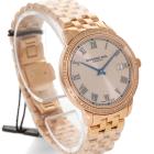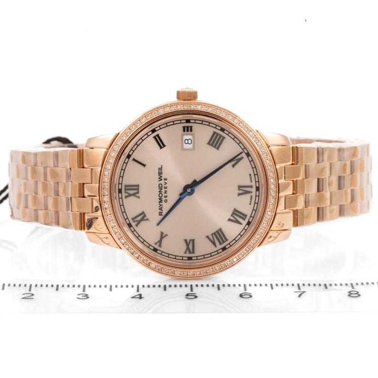 Raymond Weil Toccata rose gold PVD plated with stainless steel quartz ladies watch. Rose gold dial, Diamond set bezel, date, case diameter: 34mm, wrist size: 17.5cm, Swiss made. Ref# c. With Raymond Weil Rose gold plated bracelet and clasp. With Raymond Weil Guarantee card, Raymond Weil Certificate of Authenticity card and Raymond Weil box. 12 month FSA warranty (As new, Note: bracelet in original wrapping)