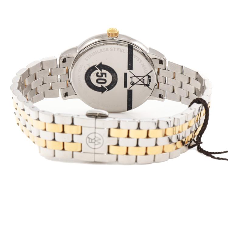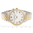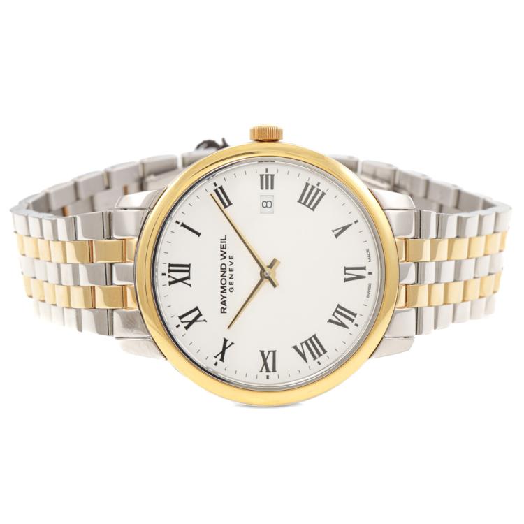 Raymond Weil Toccata stainless steel with yellow gold PVD plating quartz mens watch. White dial, date, case diameter: 39mm, wrist size: 21.5cm, Swiss made. Ref# 5485-STP-00300. With Raymond Weil two-tone bracelet and clasp. With Undated Raymond Weil Guarantee card and Raymond Weil box. 12 month FSA warranty (As new, Note: minor scuff on case and bracelet due to being display stock)