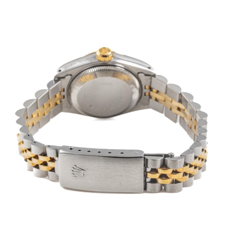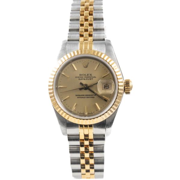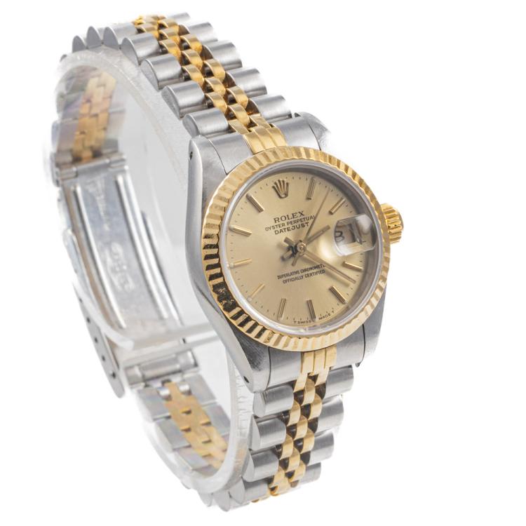 Rolex Oyster Perpetual Datejust 18ct yellow gold and stainless steel automatic ladies watch. Gold dial, date, case diameter: 26mm, wrist size: 16.5cm, Swiss made. Ref# 69173. Circa: 1988. With Rolex two-tone Jubilee bracelet and clasp. With Certificate of Authenticity and Rolex box with Rolex gift bag. 3 month FSA warranty (Pre-owned)