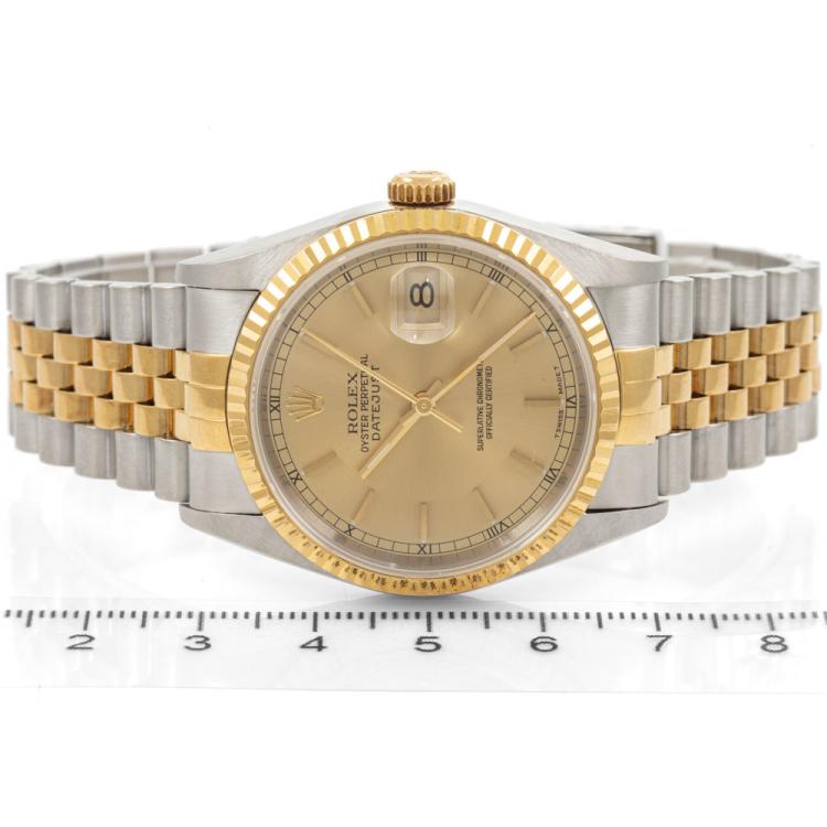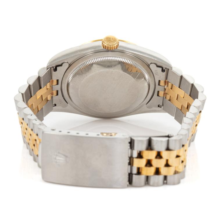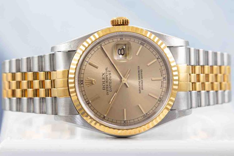 Rolex Oyster Perpetual Datejust 18ct yellow gold and stainless steel automatic mens watch. Gold dial, date, case diameter: 36mm, wrist size: 19.5cm, Swiss made. Ref# 16233. Circa: 1996. With Rolex two tone Jubilee bracelet and clasp. With Certificate of Authenticity, Rolex Guarantee Certificate dated 19/10/1998 and Rolex box with Rolex gift bag. 3 month FSA warranty (Pre-owned)
