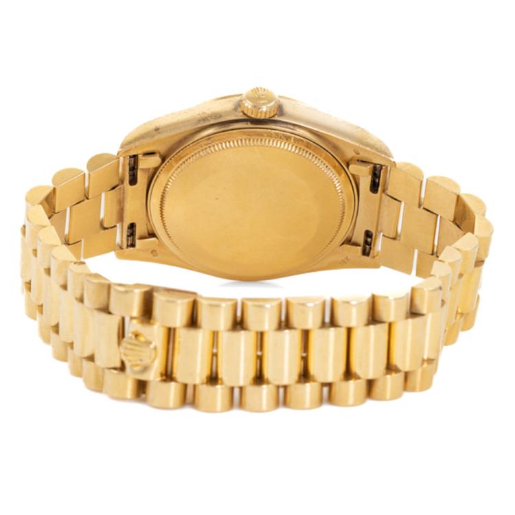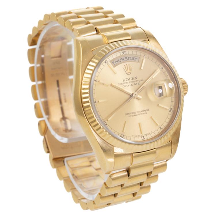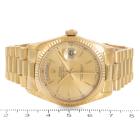 Rolex Oyster Perpetual Day-Date 18ct yellow gold automatic mens watch. Gold dial, day & date, case diameter: 36mm, wrist size: 18cm, Swiss made. Ref# 18038. Circa: 1984. With Rolex 18ct yellow gold Presidential bracelet and clasp. With Certificate of Authenticity and Rolex box. 3 month FSA warranty (Pre-owned)
