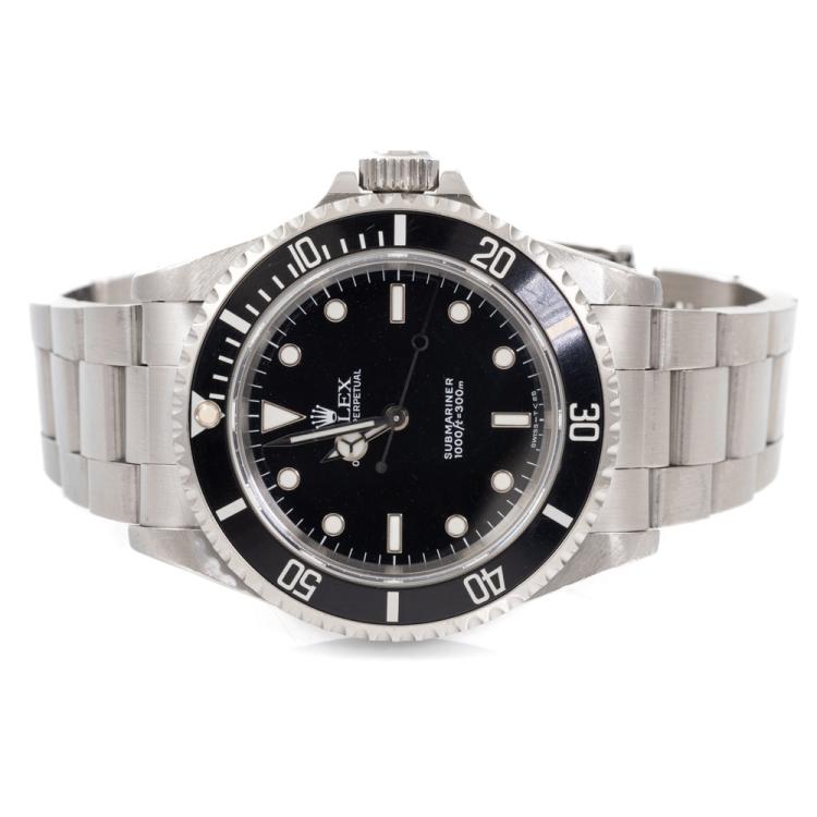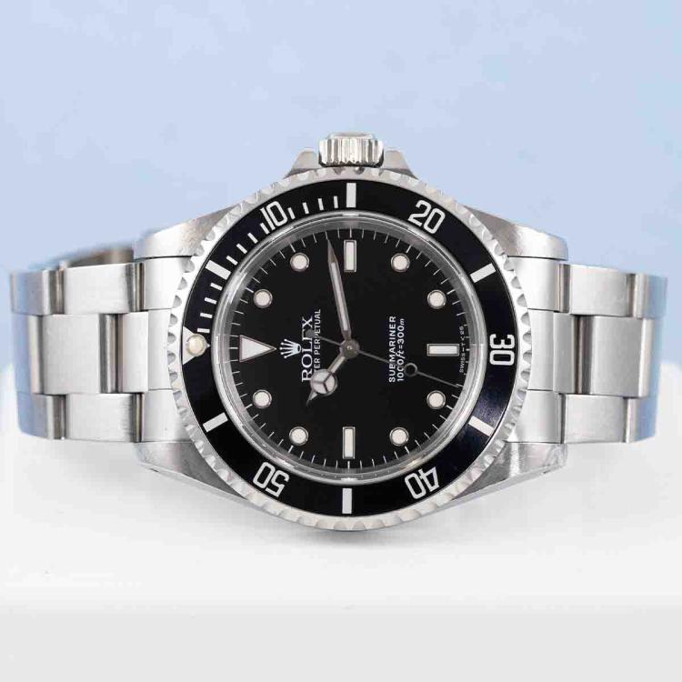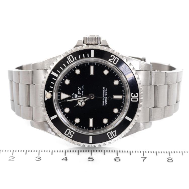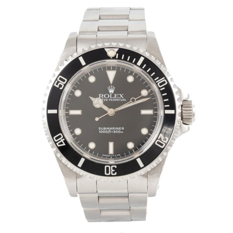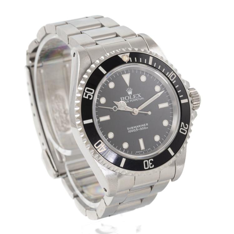 Rolex Oyster Perpetual Submariner stainless steel automatic mens watch. Black dial, case diameter: 40mm, wrist size: 18cm, Swiss made. Ref# 14060. Circa: 1995. With Rolex stainless steel Oyster bracelet and clasp. With Certificate of Authenticity and Rolex box. 3 month FSA warranty (Pre-owned)