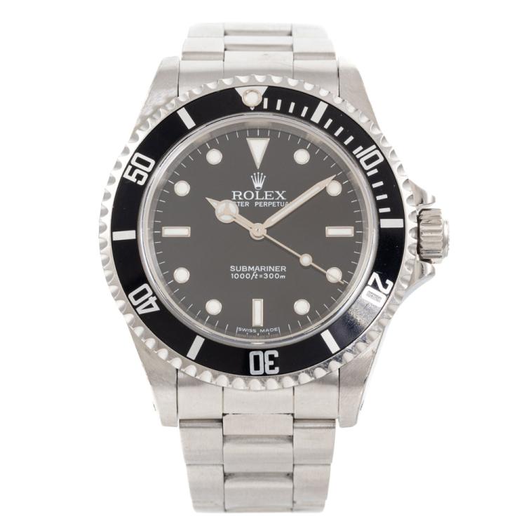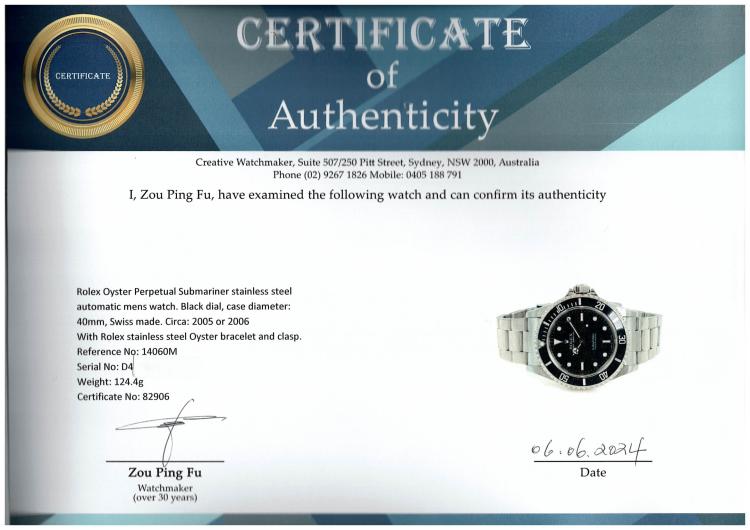 Rolex Oyster Perpetual Submariner stainless steel automatic mens watch. Black dial, case diameter: 40mm, wrist size: 17.5cm, Swiss made. Ref# 14060M, Circa: 2005 or 2006. With Rolex stainless steel Oyster bracelet and clasp. With Certificate of Authenticity and Rolex box. 3 month FSA warranty (Pre-owned)