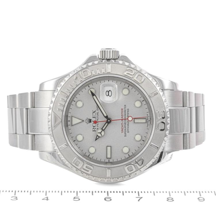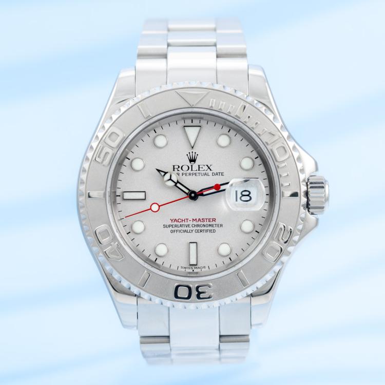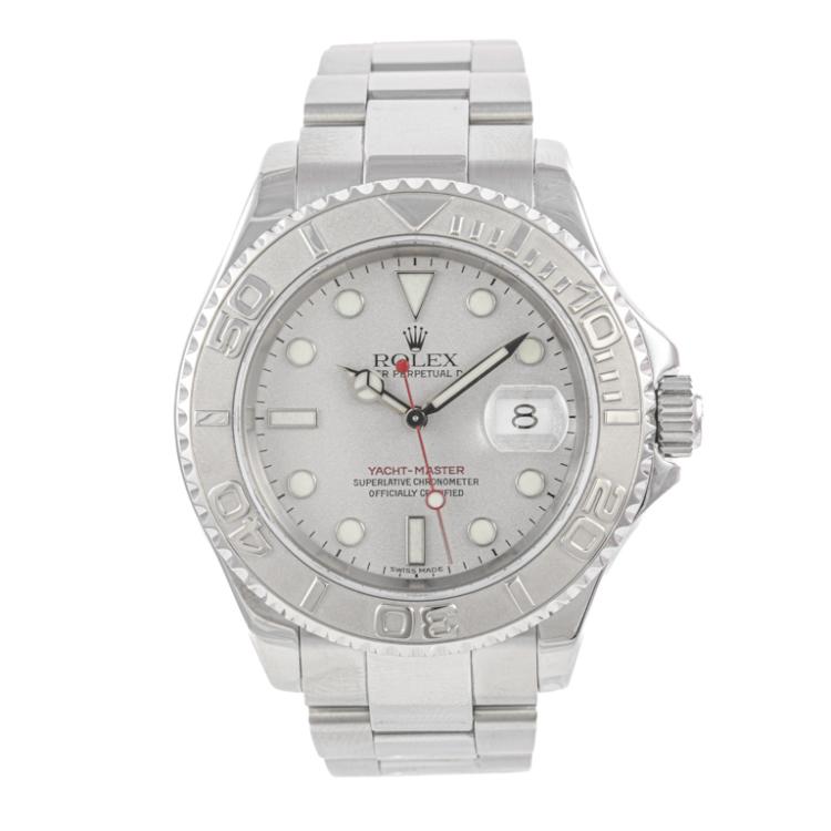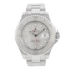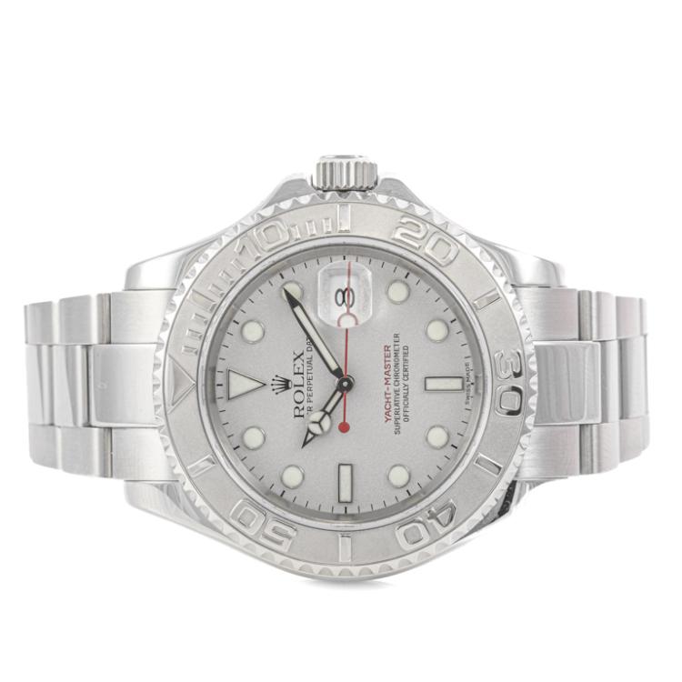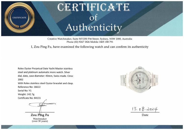 Rolex Oyster Perpetual Date Yacht Master stainless steel and platinum automatic mens watch. Silver dial, date, case diameter: 40mm, wrist size: 17.5cm, Swiss made. Ref# 16622. Circa: 2002. With Rolex stainless steel Oyster bracelet and clasp. With Certificate of Authenticity, Rolex International Service Guarantee card dated 31/03/2014 and Rolex box. 3 month FSA warranty. (Pre-owned)
