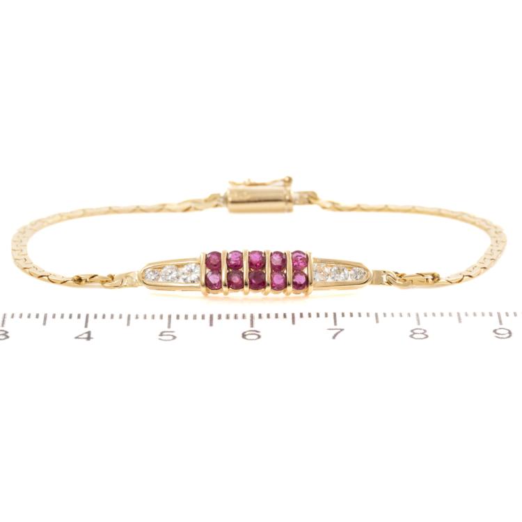 Ruby and Diamond bracelet with round natural Rubies totalling approximately 0.50ct and round natural Diamonds totalling approximately 0.40ct (Estimated grading: H-I SI). 18ct yellow gold. Length: 16.5mm. Weight: 5.3g. (Pre-Owned)