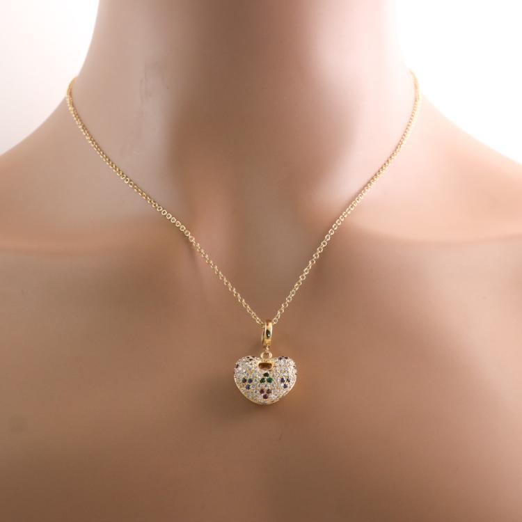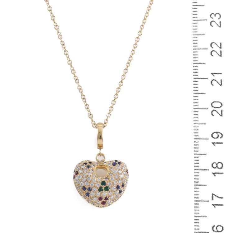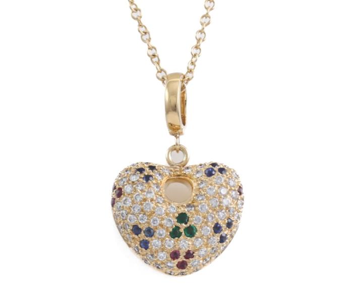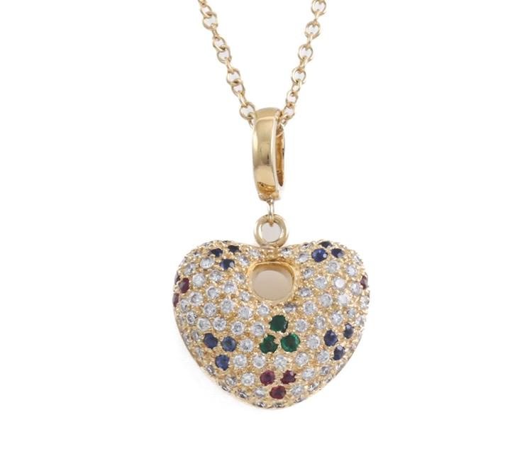 Heart shape pendant with round Natural Rubies totalling 0.24ct, round Natural Blue Sapphires totalling 0.35ct, round Natural Emerald 0.06ct and round Natural Diamonds totalling 0.74ct (Estimated grading: G VS-SI). 18ct yellow gold with 45cm 18ct yellow gold chain. Weight: 9.6g. (Pre-owned)