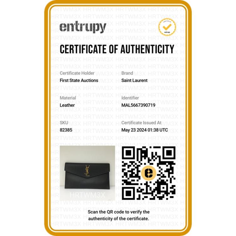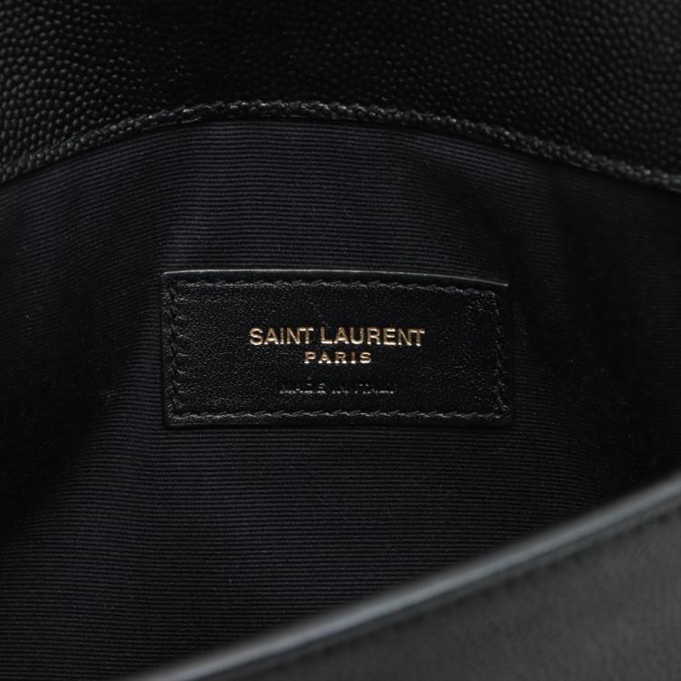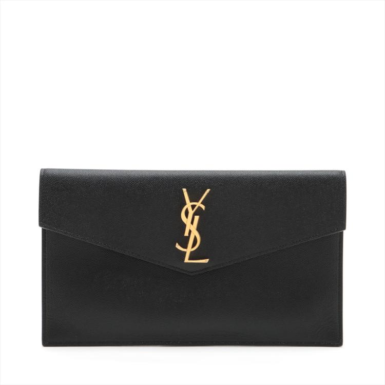 Saint Laurent Uptown pouch in black De Poudre embossed calf-skin leather. Featuring in gold-toned handwear, frontal flap with "YSL" logo and magnetic closure on front. The flap opens to a black fabric lining interior. Approximate dimensions: 27cm(L) x 16cm(H) x 0.5cm(D). Accompanied by a YSL dust bag and box. With Entrupy Certificate of Authenticity. (Pre-owned)^