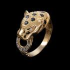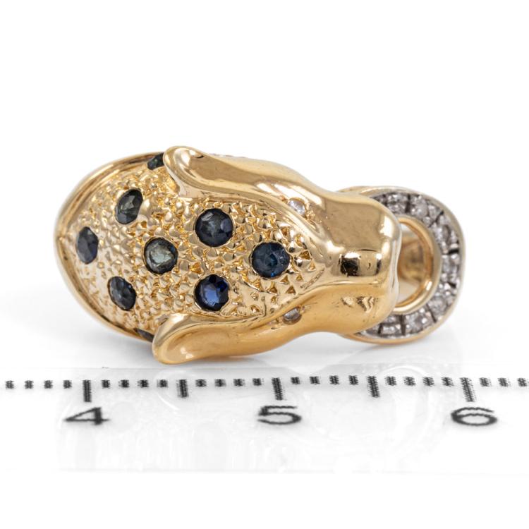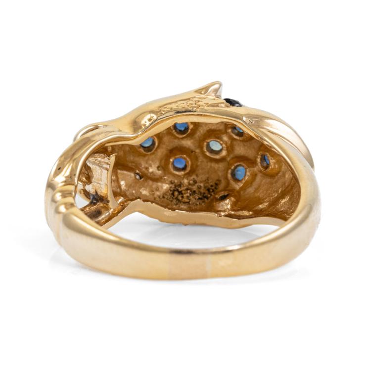 Sapphire and Diamond panther designed ring with round natural blue Sapphires totalling approximately 0.27ct and round natural Diamonds totalling approximately 0.03ct. 18ct yellow gold. Ring size N. Band width: 2.6 -4.5mm. Weight: 7.0g. (Pre-owned)