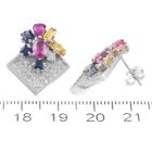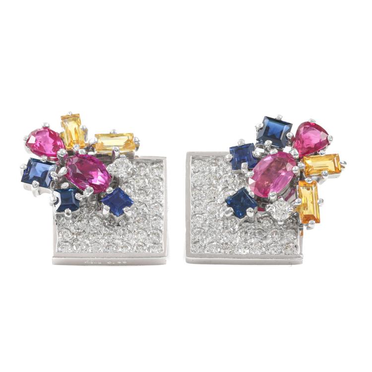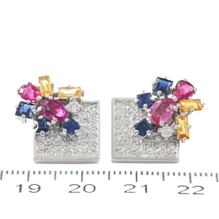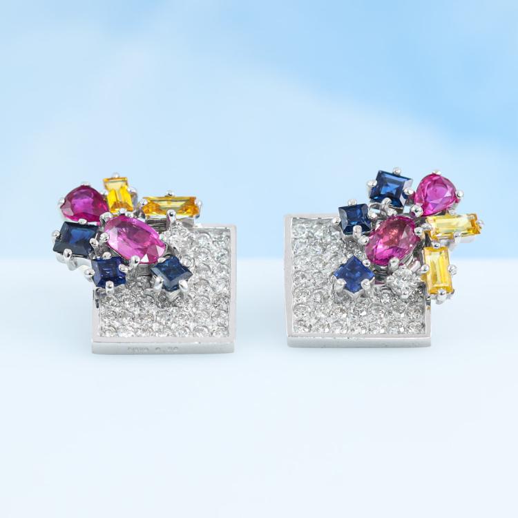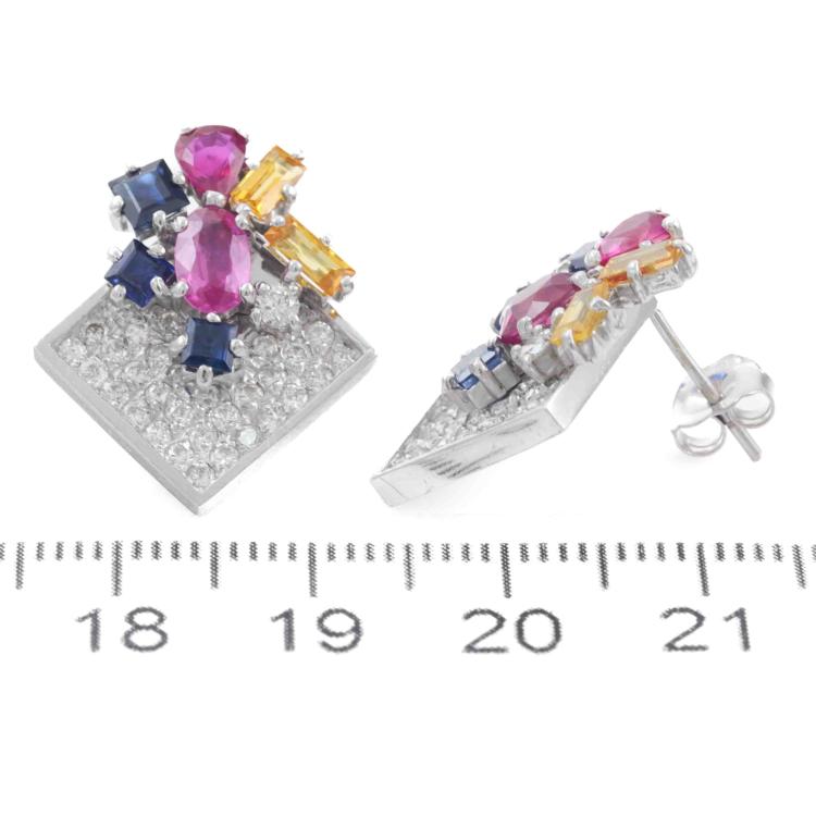 Earrings with yellow & blue Natural Sapphires totalling approximately 1.20ct, pear & oval Natural Ruby totalling approximately 1.50ct and round Natural Diamonds totalling 1.00ct (Estimated grading: I-J SI). 18ct white gold. Weight: 7.2g. (Pre-owned)