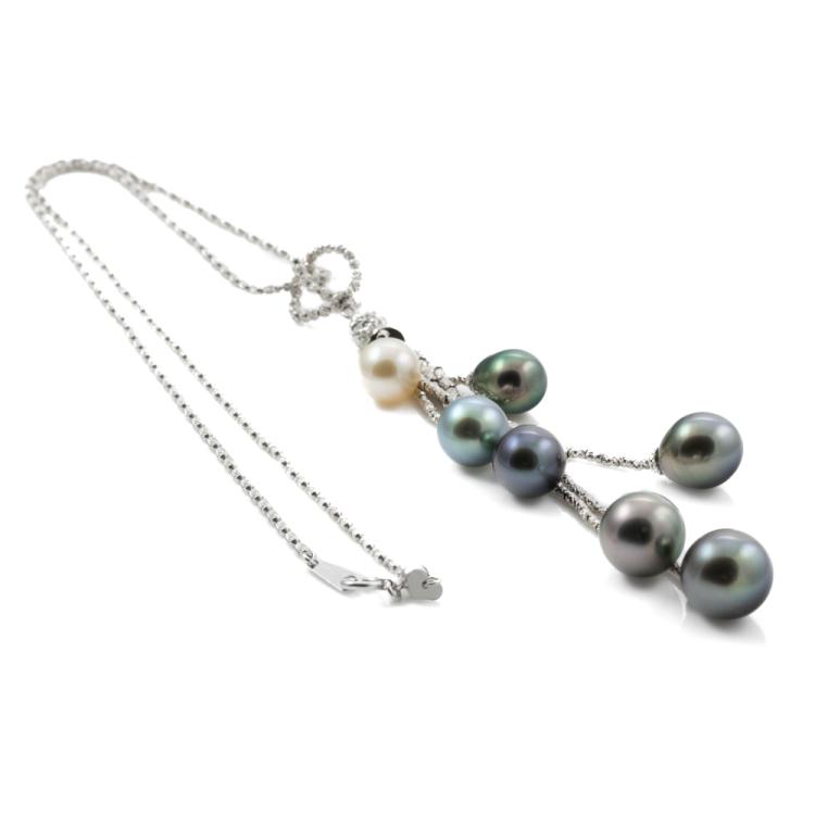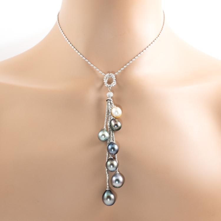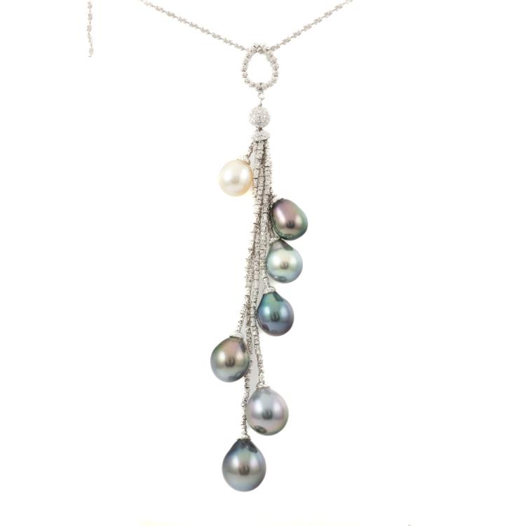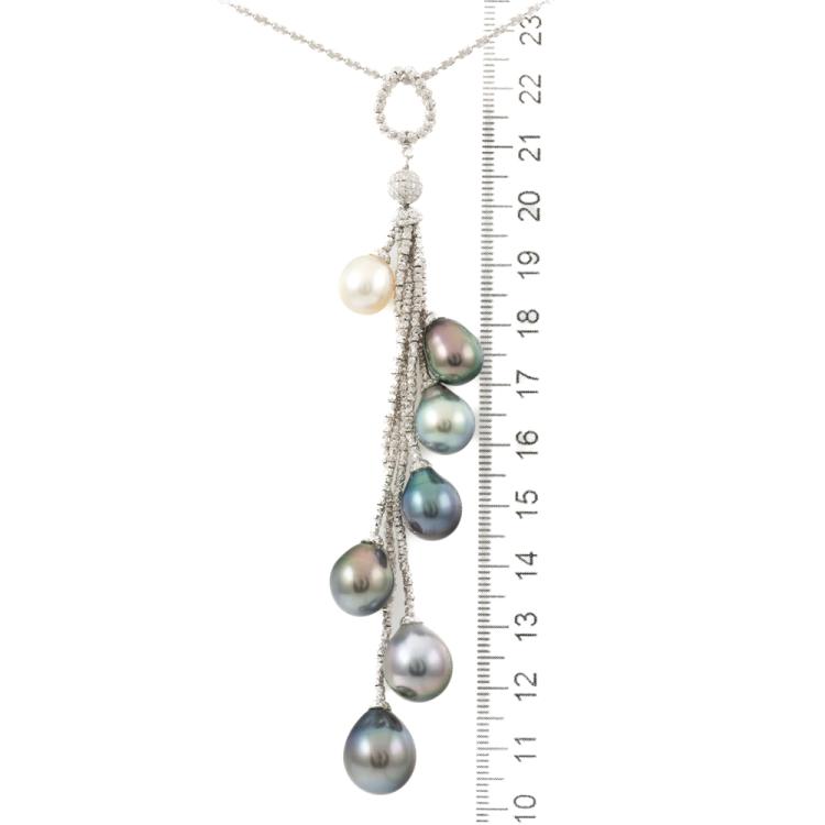 Tassel drop design Pearl pendant with 1 drop shape South Sea Pearl 9.1mm and 5 drop shape Tahitian pearls of 9.3-11.8mm. Platinum 850 with 45.5cm platinum adjustable chain. Weight: 23.8g. (Pre-owned)
