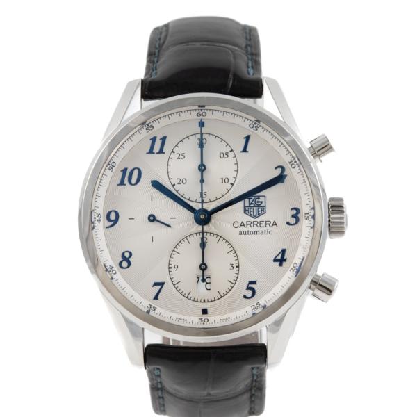 TAG Heuer Carrera Herritage stainless steel automatic mens watch. Silver chronograph dial, date, case diameter: 41mm, adjustable max wrist size: 18.5cm, Swiss made. Ref# CAS2111.FC6292. With TAG Heuer black leather strap and clasp. With Certificate of Authenticity. 3 month FSA warranty. (Pre-owned)