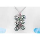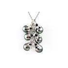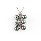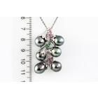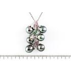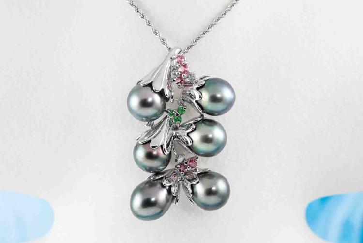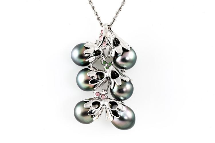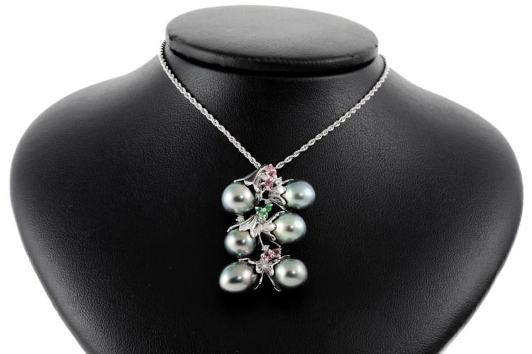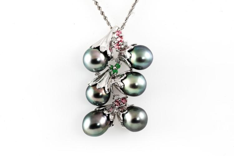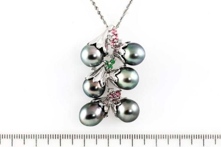 Pearl and Diamond pendant with 6 drop shape Tahitian Pearl of 9.5-9.8mm, pink & green Natural Tourmaline totalling approximately 0.30ct and round Natural Diamonds totalling 0.09ct. 14ct white gold with 45cm 14ct white gold chain. Weight: 16.3g. (Pre-owned)