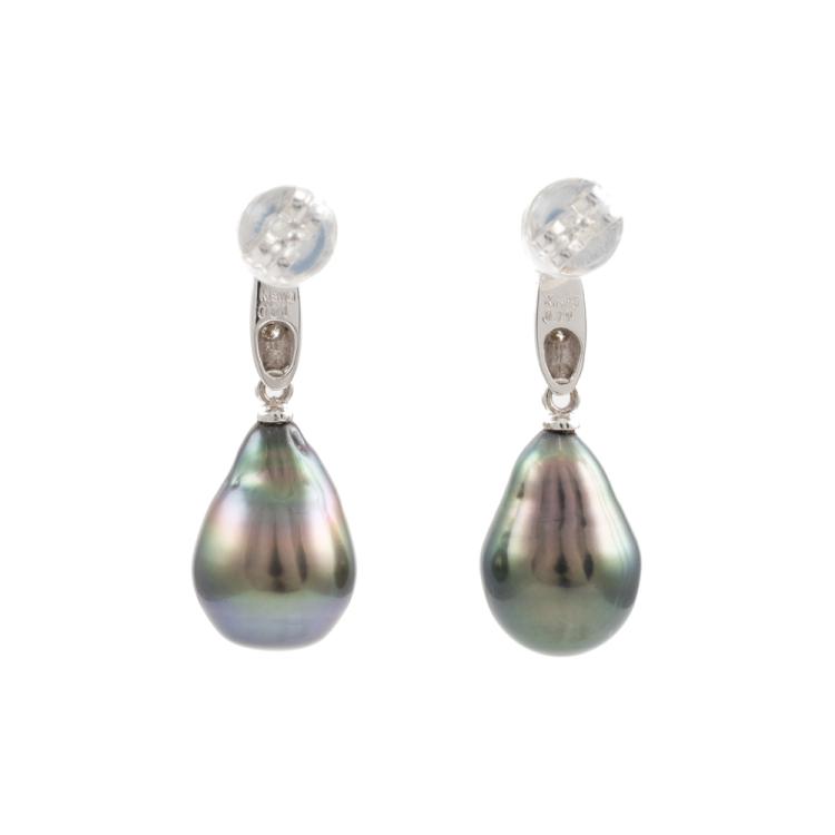 Pearl and Diamond earrings with dropped shape Tahitian Pearls of size 8.7 x 12.7mm & 8.6 x 12.7mm and round natural Diamonds totalling 0.02ct. 18ct white gold with 14ct white gold posts and 14ct white gold & silicon backs. Weight: 3.4g. (Pre-owned)
