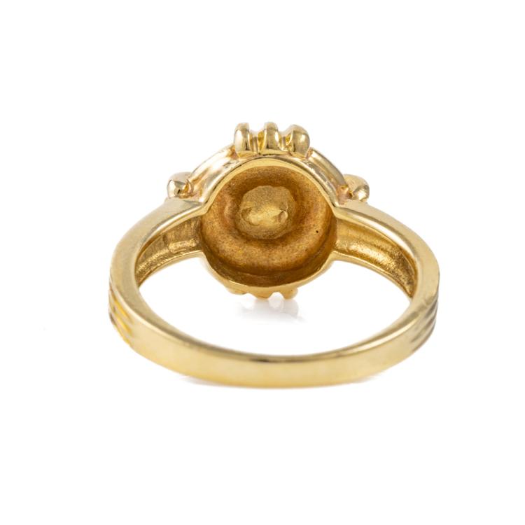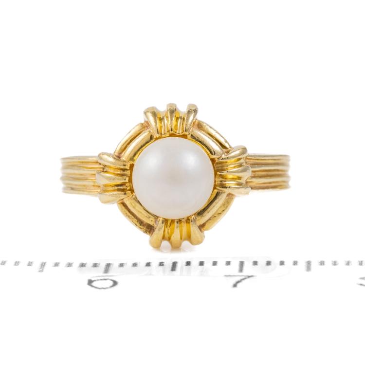 Tiffany & Co. Akoya Pearl ring with white Akoya Pearl of 6.2mm. 18ct yellow gold. Ring size I 1/2, - ring resizing is not recommended. Weight: 4.7g. (Pre-owned)