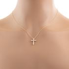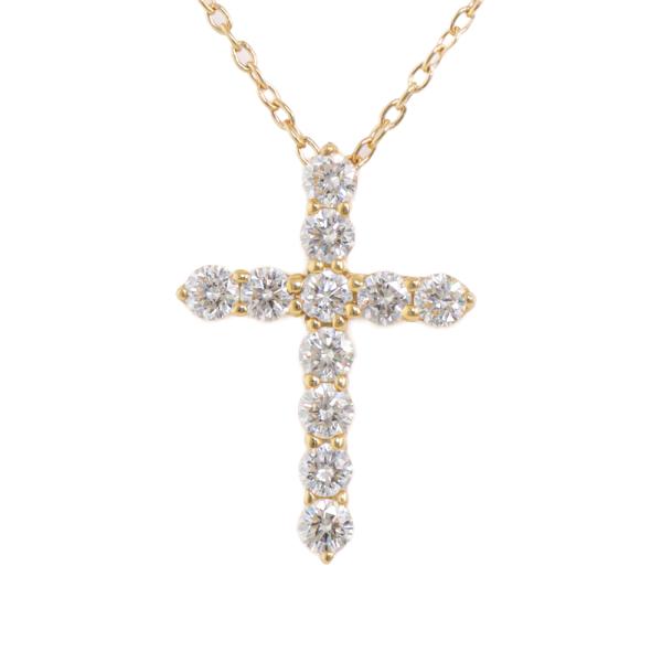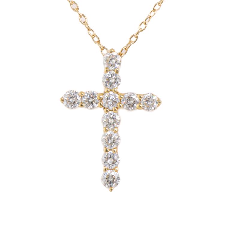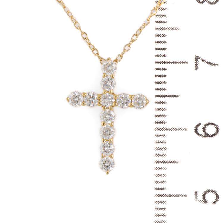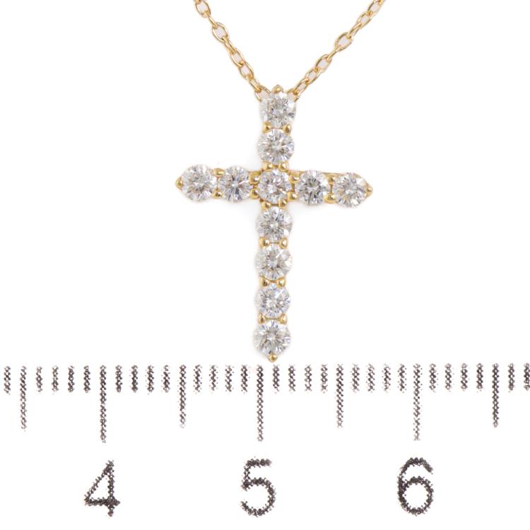 Tiffany & Co Cross pendant, small size with 11 round Natural Diamonds totalling approximately 0.42ct (Estimated grading: F-G VS). Cross motif size: 17.5mm x 12.5mm. 18ct yellow gold with 45.5cm Tiffany & Co 18ct yellow gold chain. Weight: 2.4g. (Pre-owned)