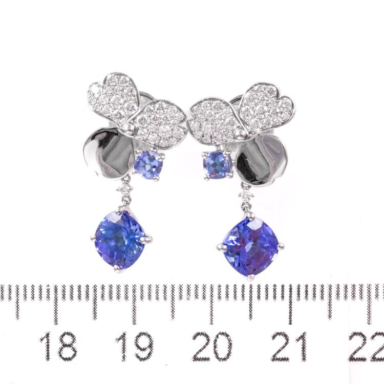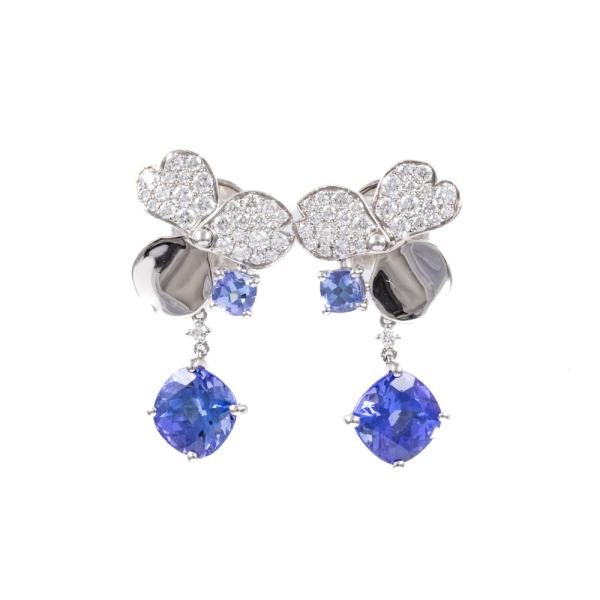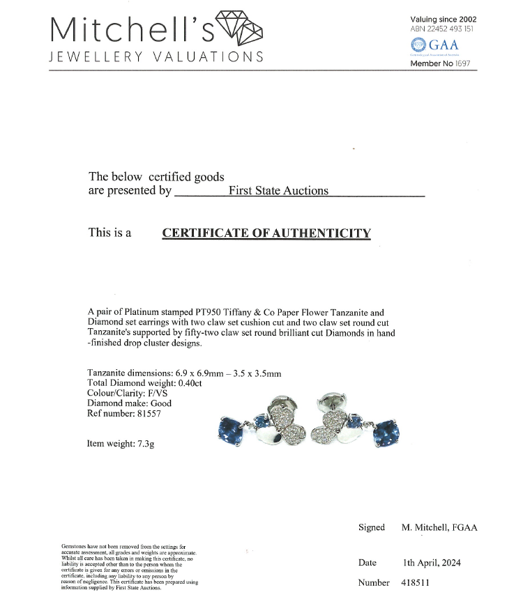Tiffany & Co. Paper Flower Tanzanite & Diamond earrings with cushion & round cut Natural Tanzanite of size 6.6mm x 6.9mm & 3.5mm x 3.5mm and round Natural Diamonds totalling 0.40cts (Estimated grading: F VS). Platinum 950 with Platinum 950 secure-lock backs. Weight: 7.3g. With Certificate #418511. (Pre-owned)