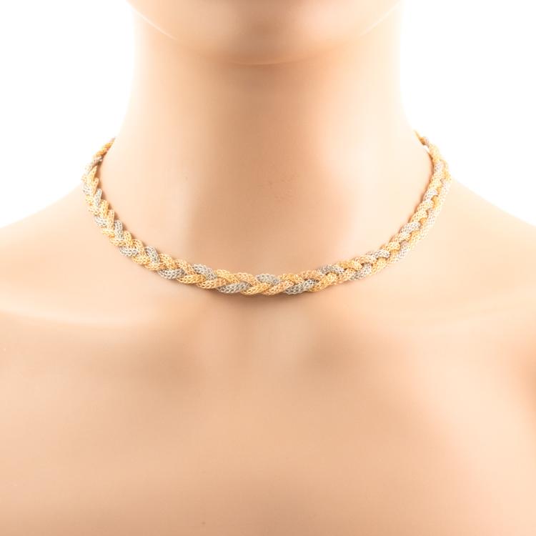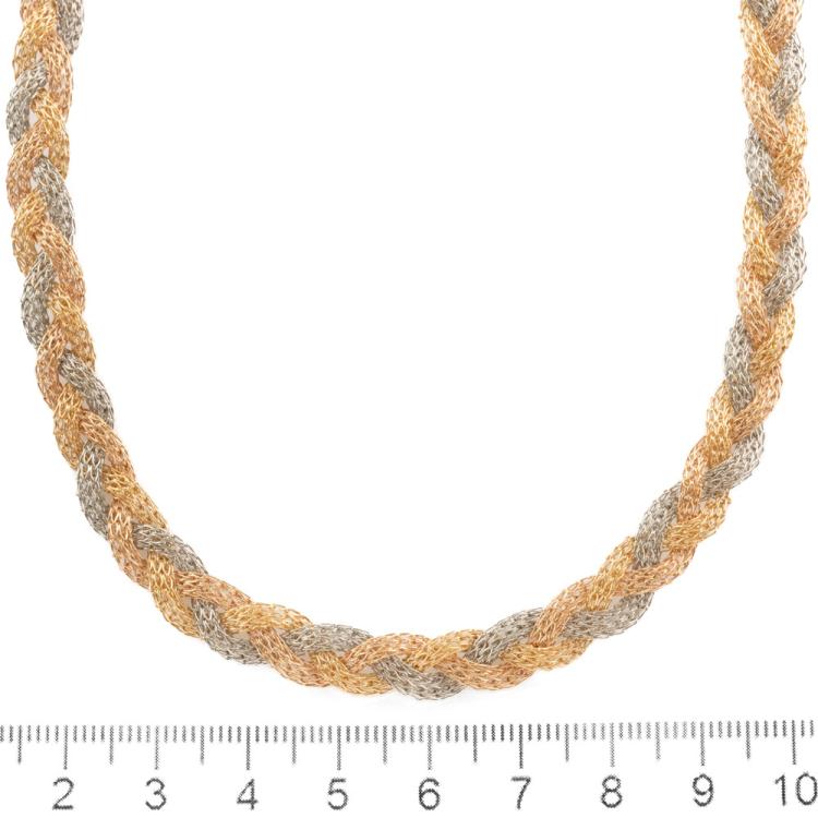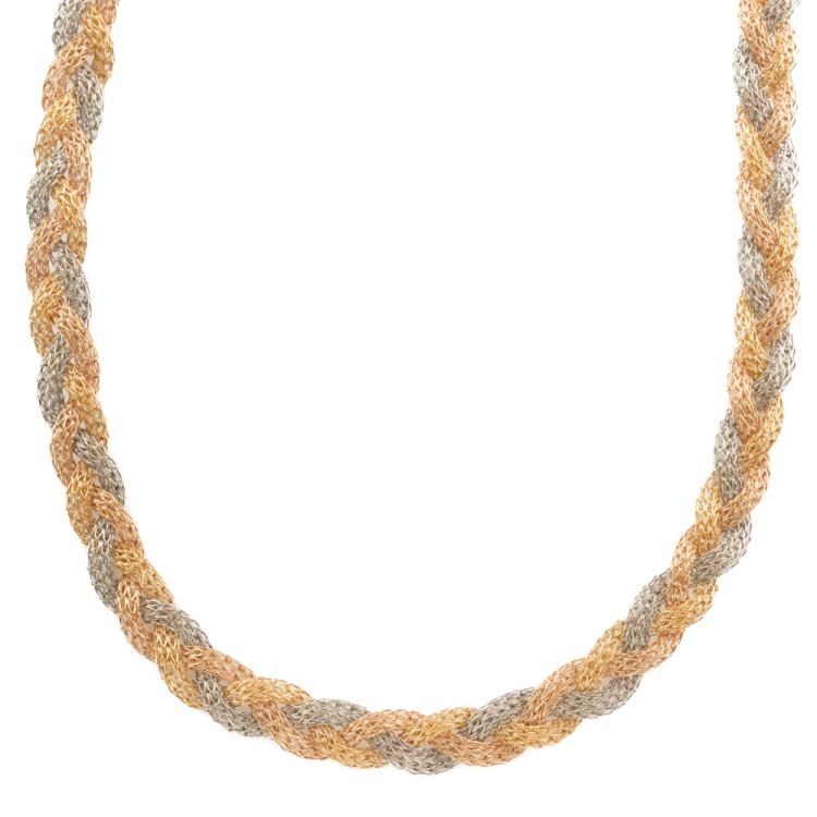 18ct yellow, rose & white gold woven necklace. Length: 41cm. Weight: 15.7g. (Pre-owned)