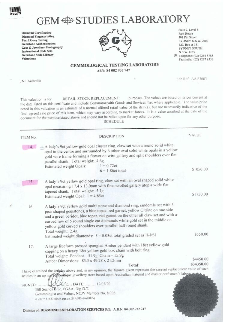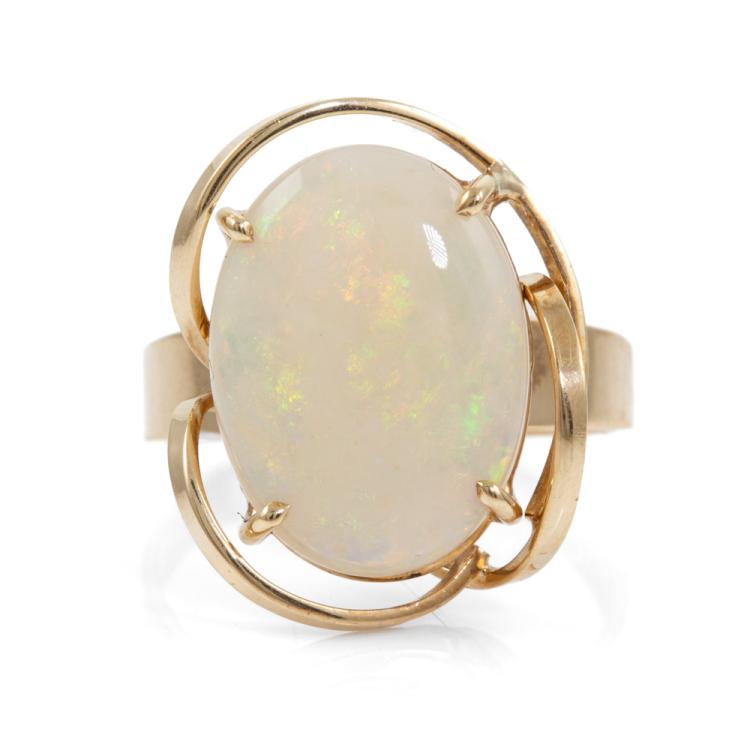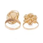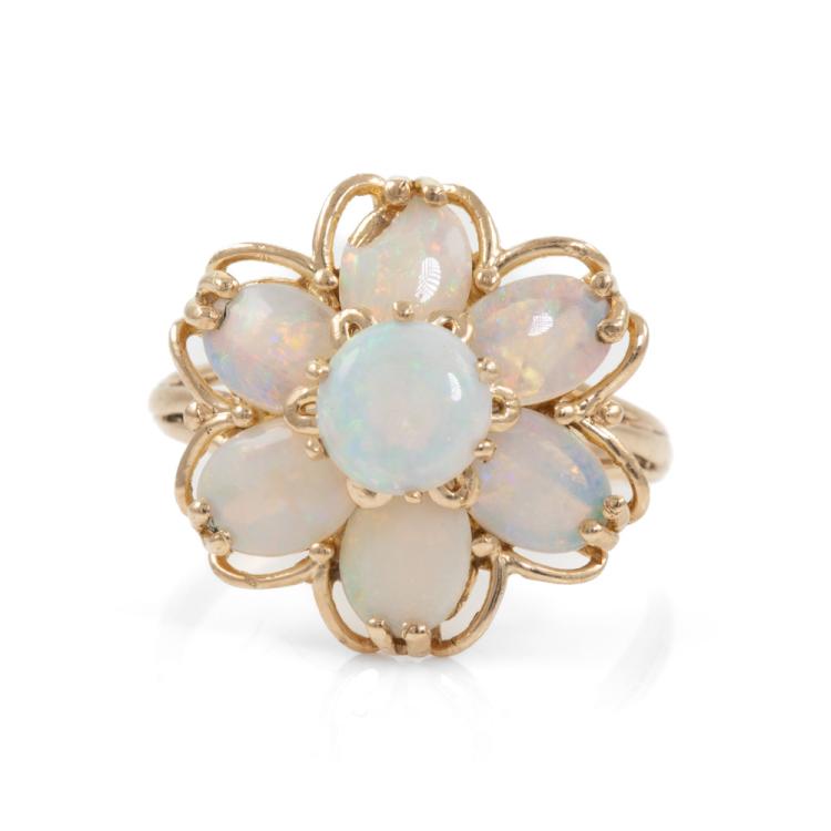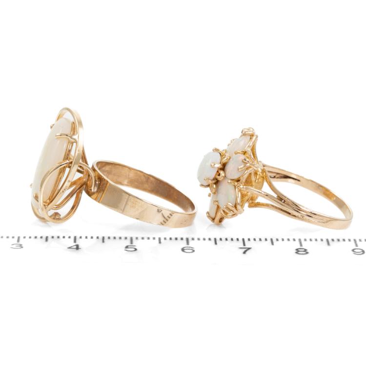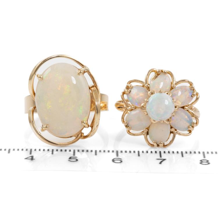 Two Opal ring set. A floral design ring with 1 round & 6 oval solid natural white Opals totalling 2.58cts, ring size: P1/2, band width: 2mm - 3.4mm, weight: 4.6g. And a Opal ring with oval solid natural white Opal of 4.65cts (17.4mm x 13.0mm), ring size: S, band width: 2.7mm - 4.9mm, weight: 5.1g. Both 9ct yellow gold. Total weight: 9.7g. With copy of GSL valuation #AA 63603 item 14 & 15. (Pre-Owned)^