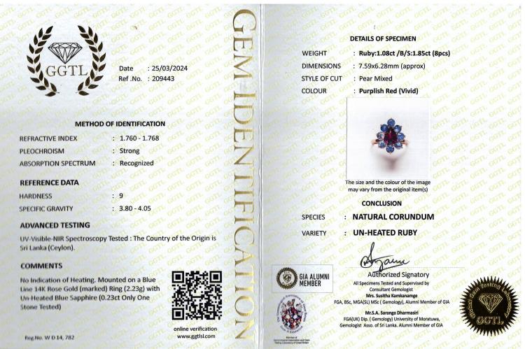 Ruby and Sapphire ring with a pear shape natural unheated Ceylon Ruby of 1.08ct and round unheated blue natural Sapphires totalling 1.85ct (Note, only one Sapphire of 0.23ct tested). 14ct rose gold. Ring size J. Band width: 1.4mm. Weight: 2.2g. With GGTL Report #209443. (As new)