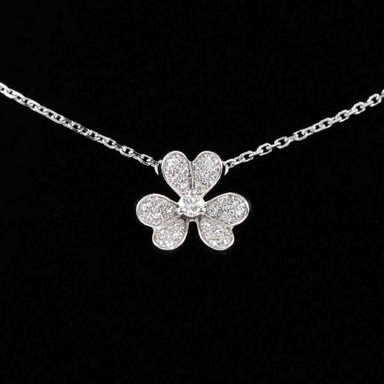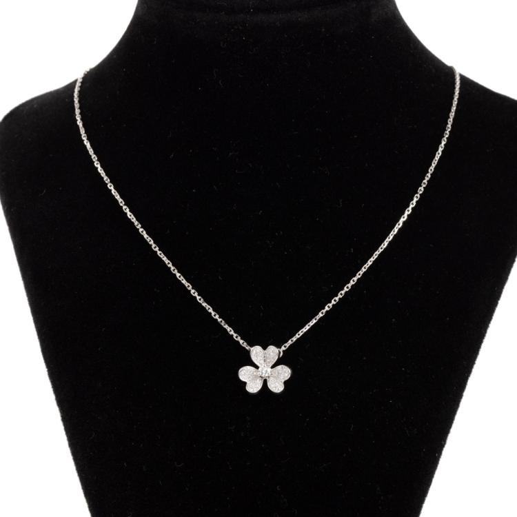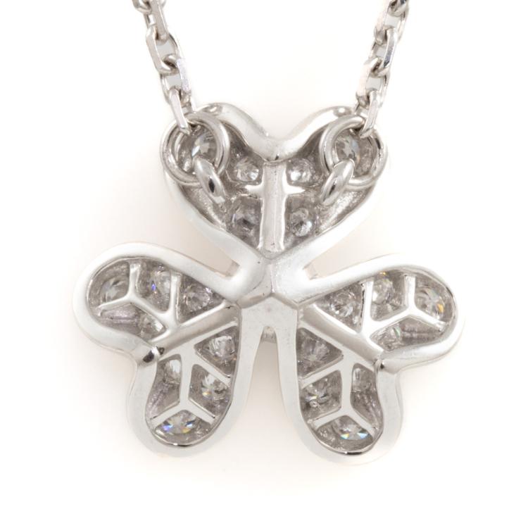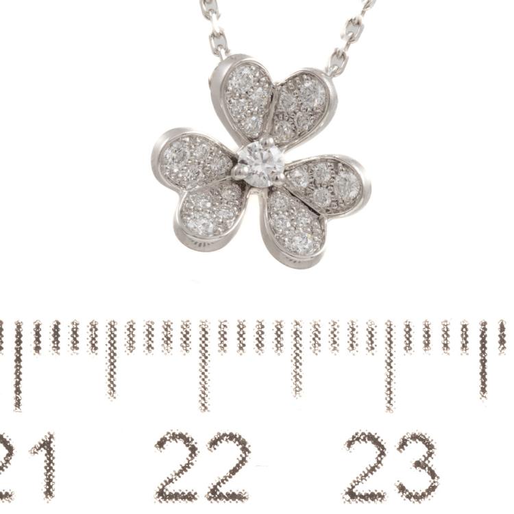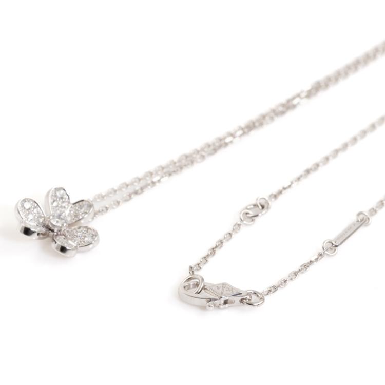 Van Cleef & Arpels Frivole pendant, mini model with 25 round Natural Diamonds totalling 0.21cts. Motif size: 10mm X 11mm. 18ct white gold with 18ct white gold attached chain. Adjustable max length: 40cm. Weight: 3.4g. With Van Cleef & Arpels box and Authenticity Certificate dated 29th August 2021. (Pre-owned)